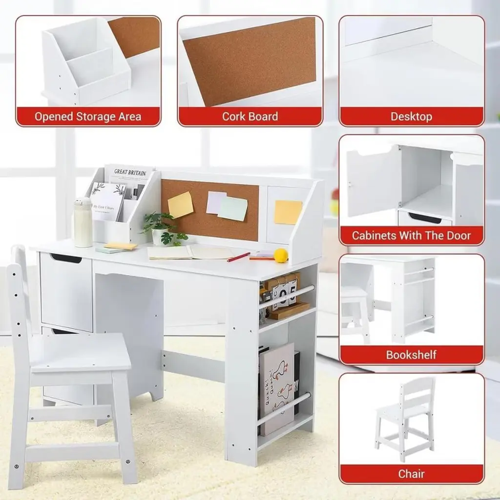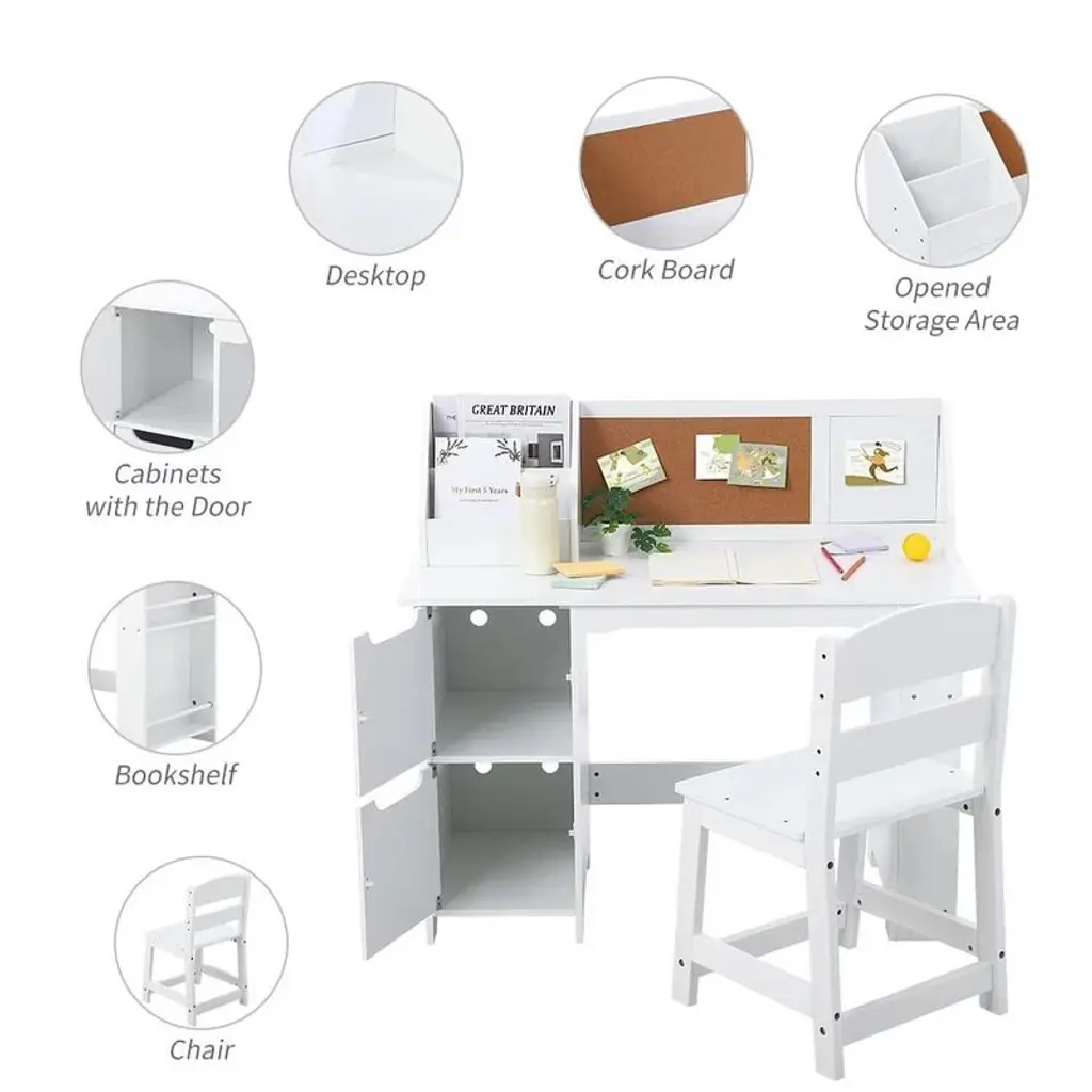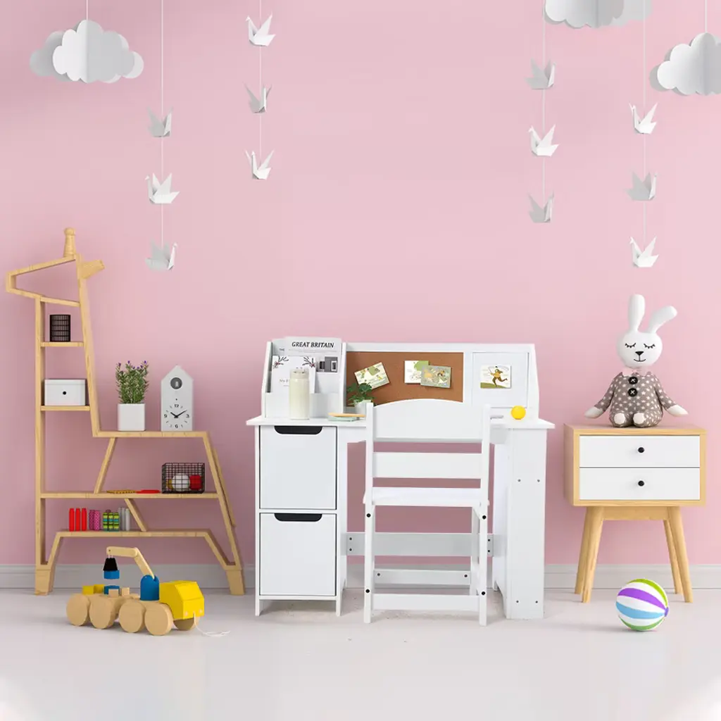 The kids desk set features generous storage options, including open storage, a bookshelf, cabinets, and a cork board. Easily organize and store personal items like photo frames, alarm clocks, mini plants, dolls, and books.