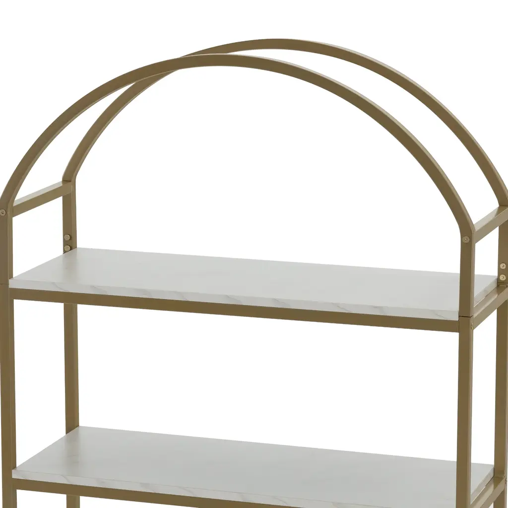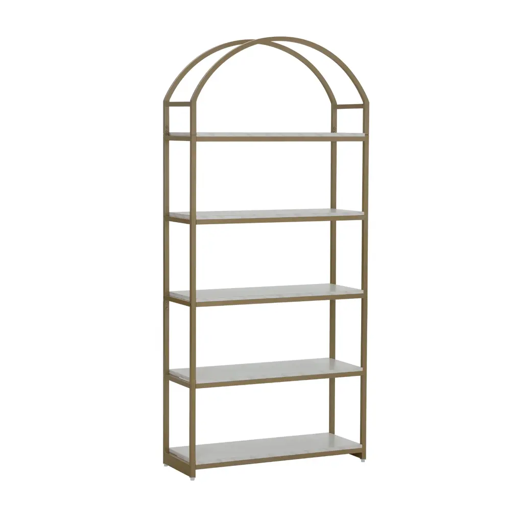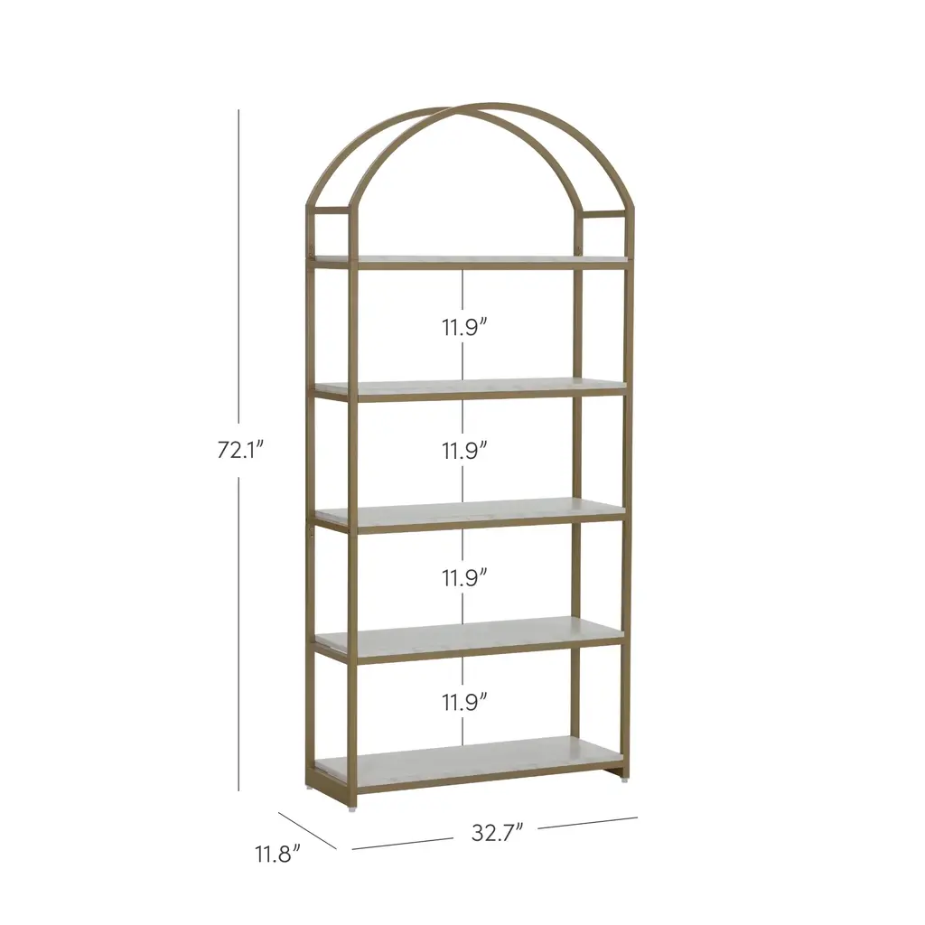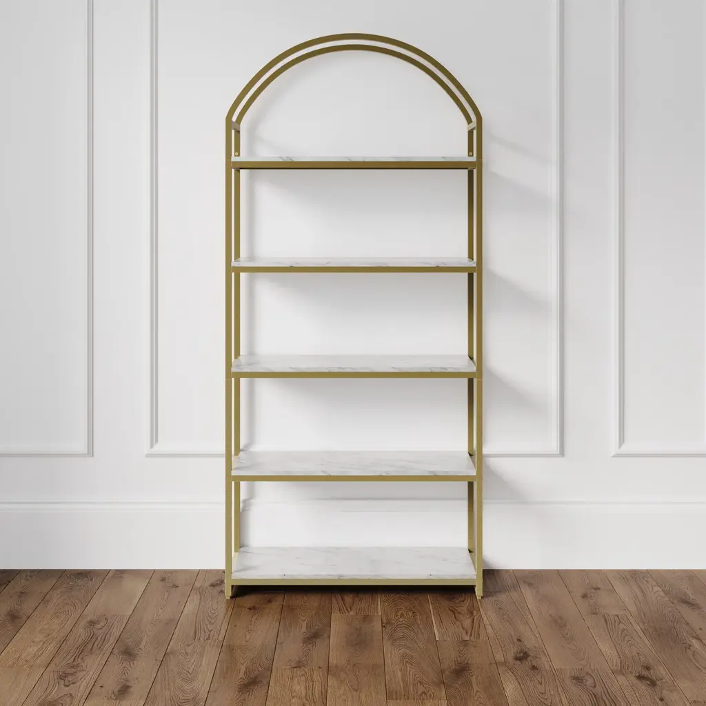 Our beautiful Haven etagere bookcase features five faux white marble shelves elevated on a gold metal frame. The sleek and durable frame is topped with an arched design that’s sure to make a statement. Its minimal silhouette fits perfectly in any home, bringing style and storage to your space. Complete the look with your favorite books and house plants for that picture-perfect shelfie moment.