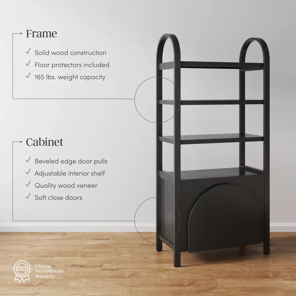 Elevate your living space with the Iris Bookshelf. Featuring a solid wood frame and quality wood veneer, this bookshelf boasts unique arched door details that double as door pulls. With a combination of open shelving and enclosed storage, it offers ample space for your belongings. The adjustable interior shelf provides flexibility, and the adjustable leveling floor protectors ensure stability. Whether you use it by itself as a bold statement piece or multiple units side-by-side, the Iris Bookshelf brings bohemian elegance to any room.