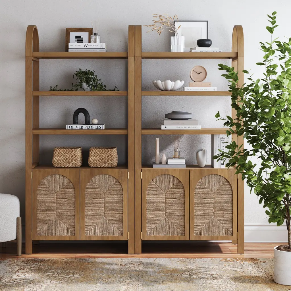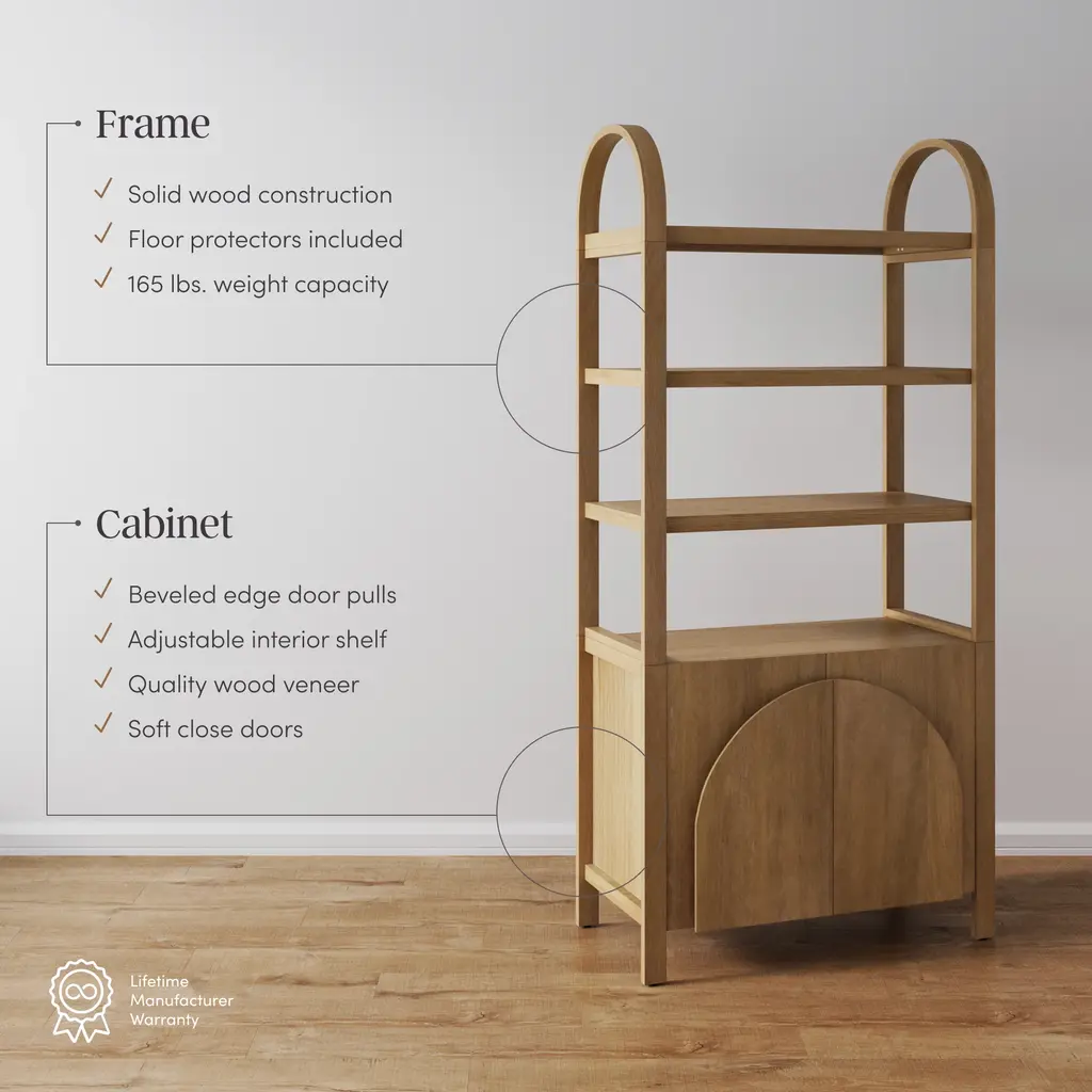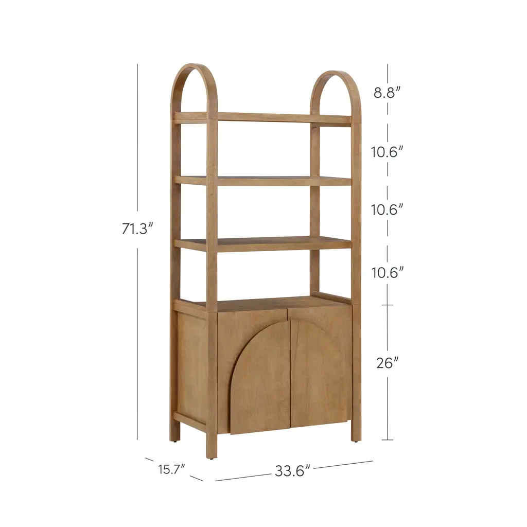 Elevate your living space with the Iris Bookshelf. Featuring a solid wood frame and quality wood veneer, this bookshelf boasts unique arched door details that double as door pulls. With a combination of open shelving and enclosed storage, it offers ample space for your belongings. The adjustable interior shelf provides flexibility, and the adjustable leveling floor protectors ensure stability. Whether you use it by itself as a bold statement piece or multiple units side-by-side, the Iris Bookshelf brings bohemian elegance to any room.