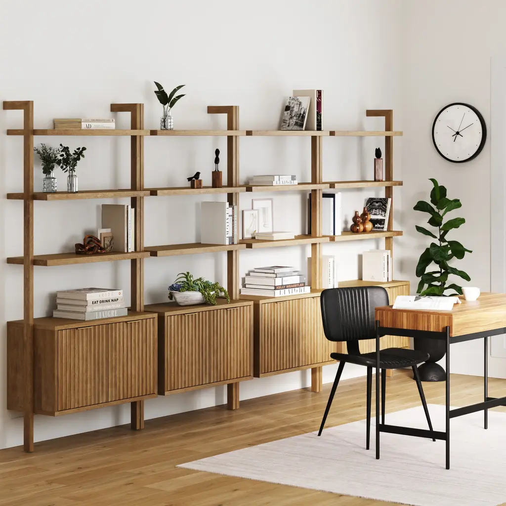 Make a refined, mid-century statement with this set of Jasper Bookshelves. Fluted solid wood doors, rich unbrushed light brown finishes, and brass-colored hardware create a warm, elevated look with plenty of function. Open shelving offers display space, while closed storage keeps essentials out of sight. Each unit is built with solid wood legs and interior supports and secures to the wall for added safety. Use them side by side for a striking, cohesive display or spread throughout your home.
