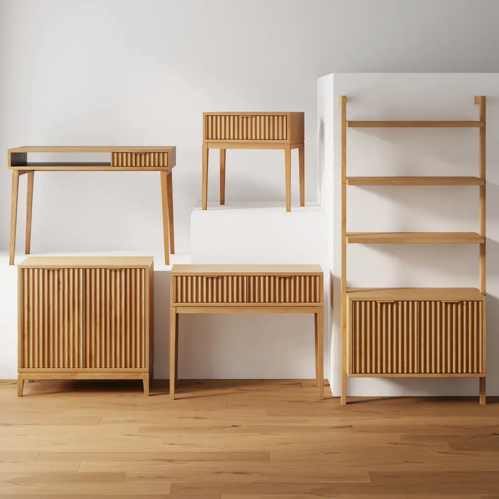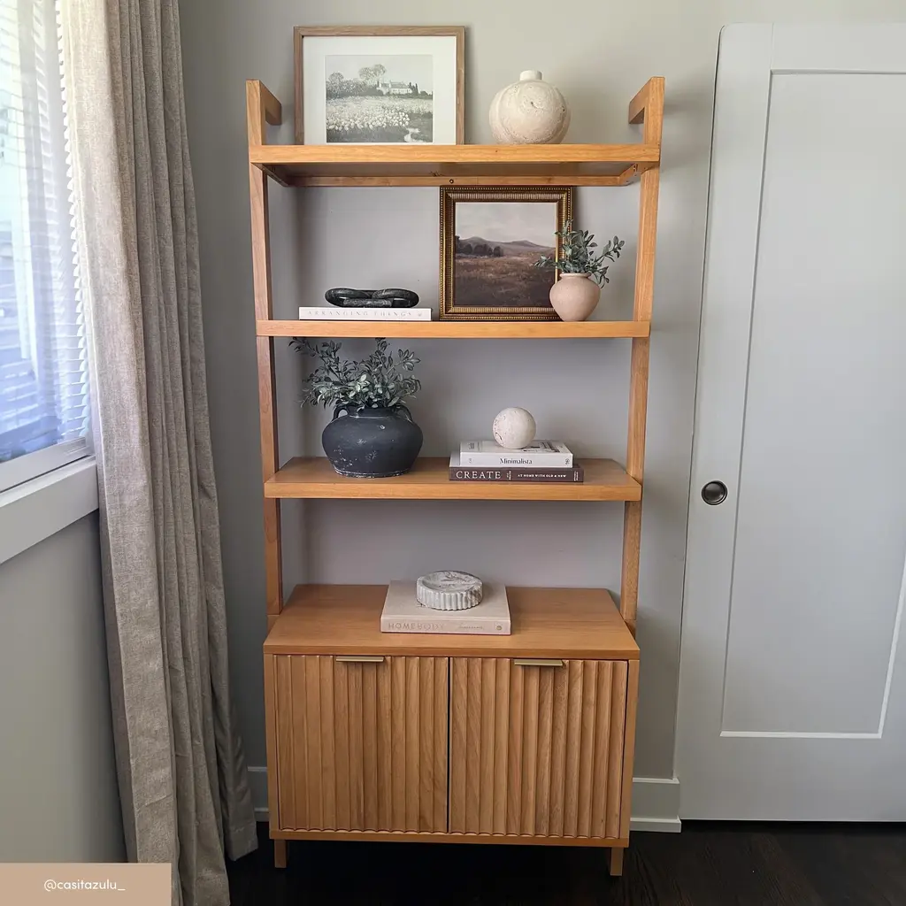 Elevate your space with this set of Jasper Bookshelves, designed to blend rich texture with refined function. Each piece features a natural brown finish, fluted solid wood doors, and subtle gold-toned accents for a warm, modern look. Open shelving offers room to display, while closed storage keeps essentials tucked away. Built with solid wood supports and legs, each unit secures directly to the wall for added safety. Style them side by side for a cohesive, high-impact statement.