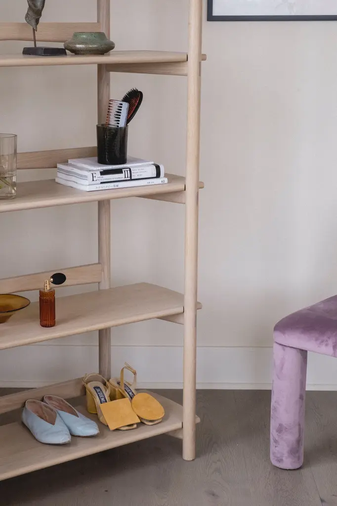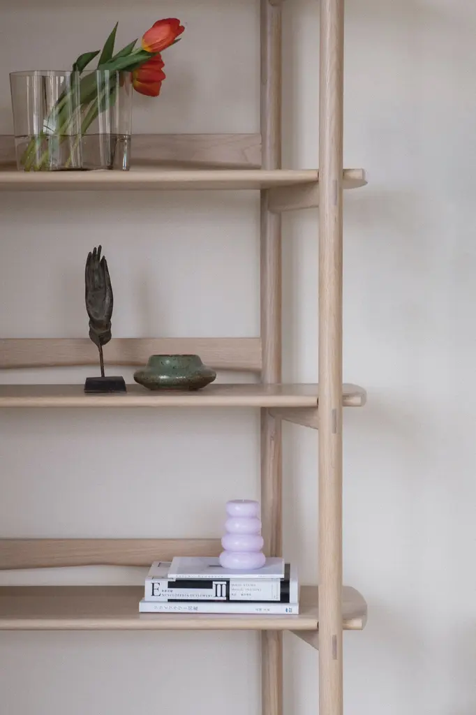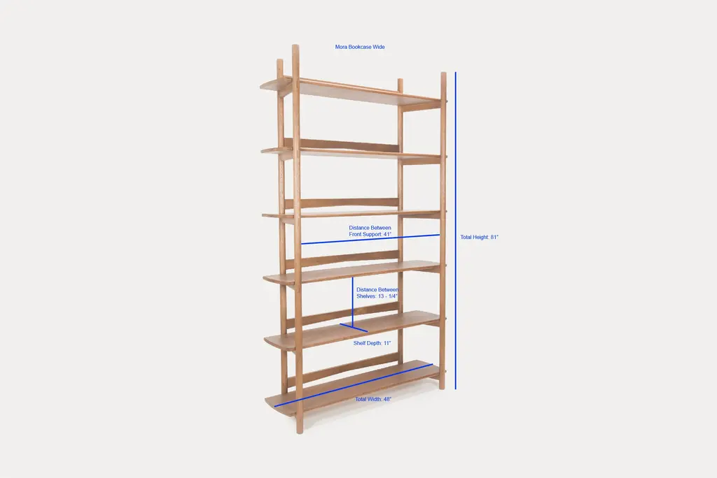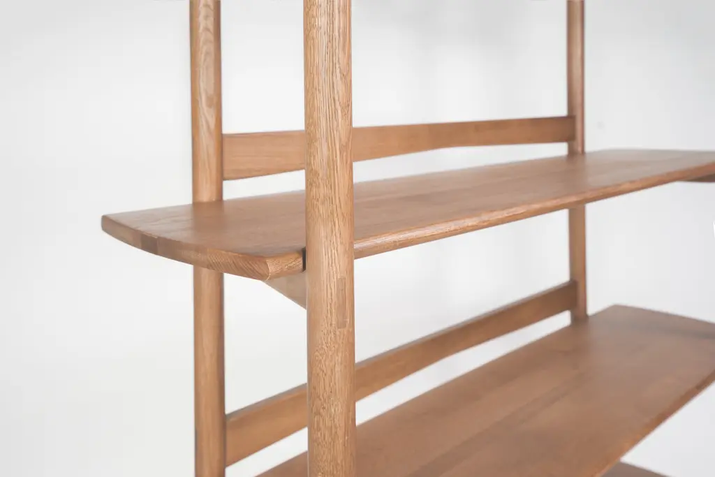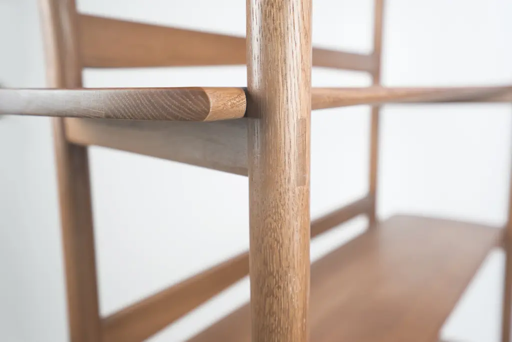 Built from solid white oak, finished in our house-made tenna oil, and handcrafted using traditional joinery techniques with exposed tenons visible throughout. It’s design is both utilitarian and unique, with winged back detailing accentuating each shelf. Please note that we make each piece by hand, and every tree is different, so you’ll see slight variations in color and pattern. These aren’t machine made, and we use solid wood, not veneer or engineered wood!