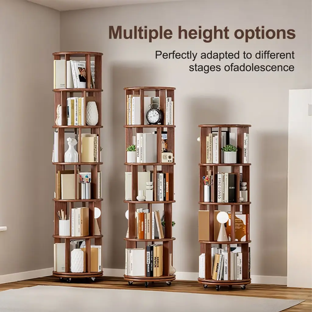 The ORRD 4-tier rotating bookshelf is built from 100% solid wood, offering strength, stability, and timeless style. Designed with a 360° spinning function and smooth-rolling wheels, this compact round bookcase provides easy access to books, décor, or toys from every angle. Its slim design is ideal for small spaces such as bedrooms, offices, or corners, while the walnut finish adds a warm, elegant touch. A practical and space-saving storage solution for kids and adults alike.