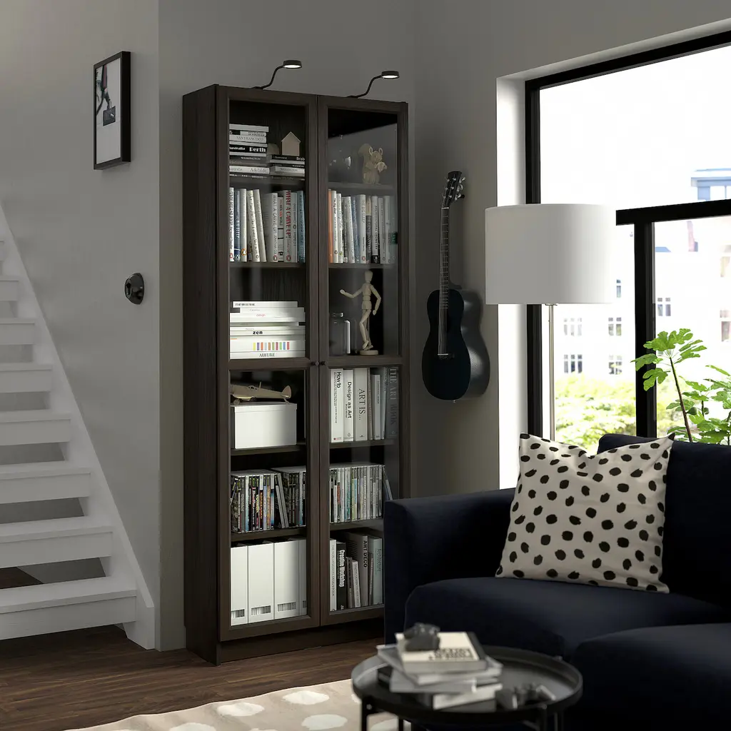 OXBERG Glass door - dark brown oak effect 15 1/2x75 3/4 ". Adding a door to BILLY bookcase gives it both a new expression and new functions such as hiding and protecting what you store. A glass door keeps your favorite items free from dust but still visible. Knob and hinges included. Knob included.
