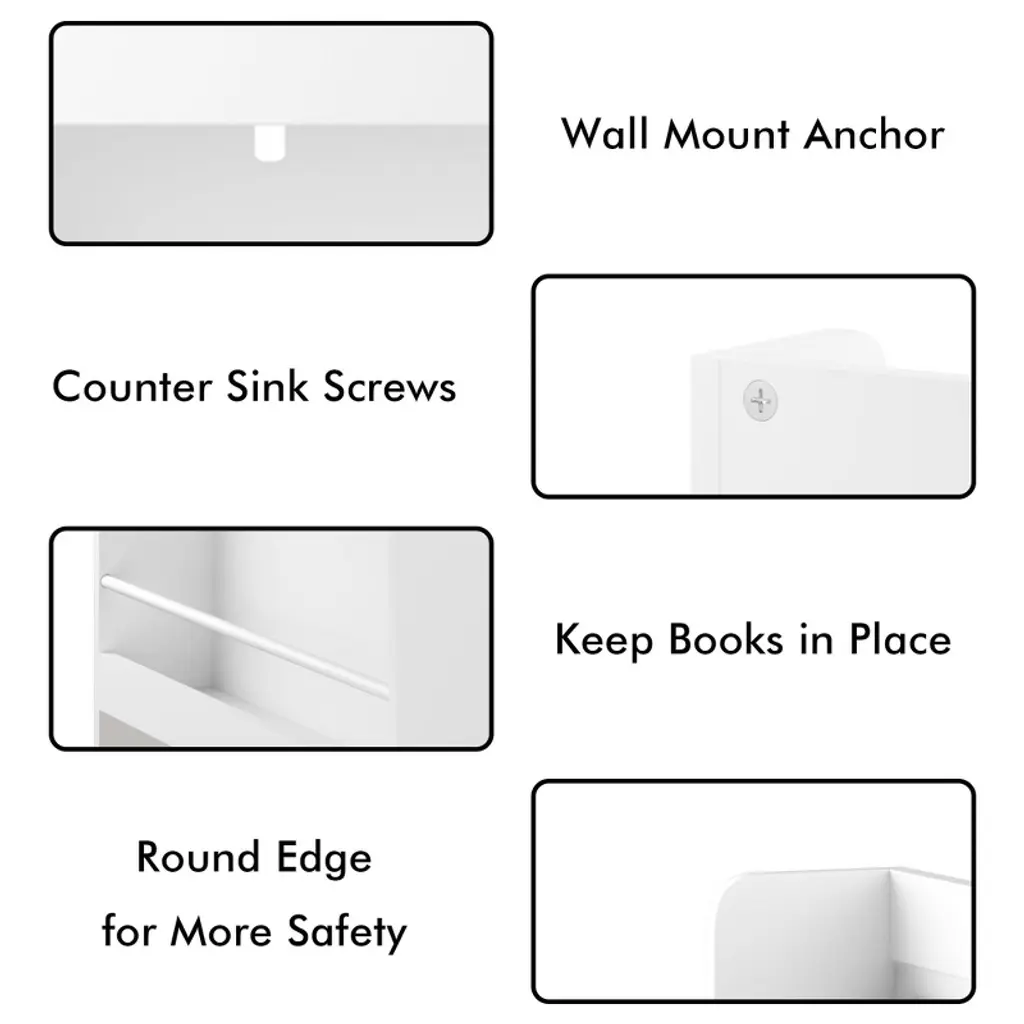Paged Wall-mounted Kids Bookshelf Modern White Book Rack With 3 Front-facing Display Shelves For Home Office, Study, White