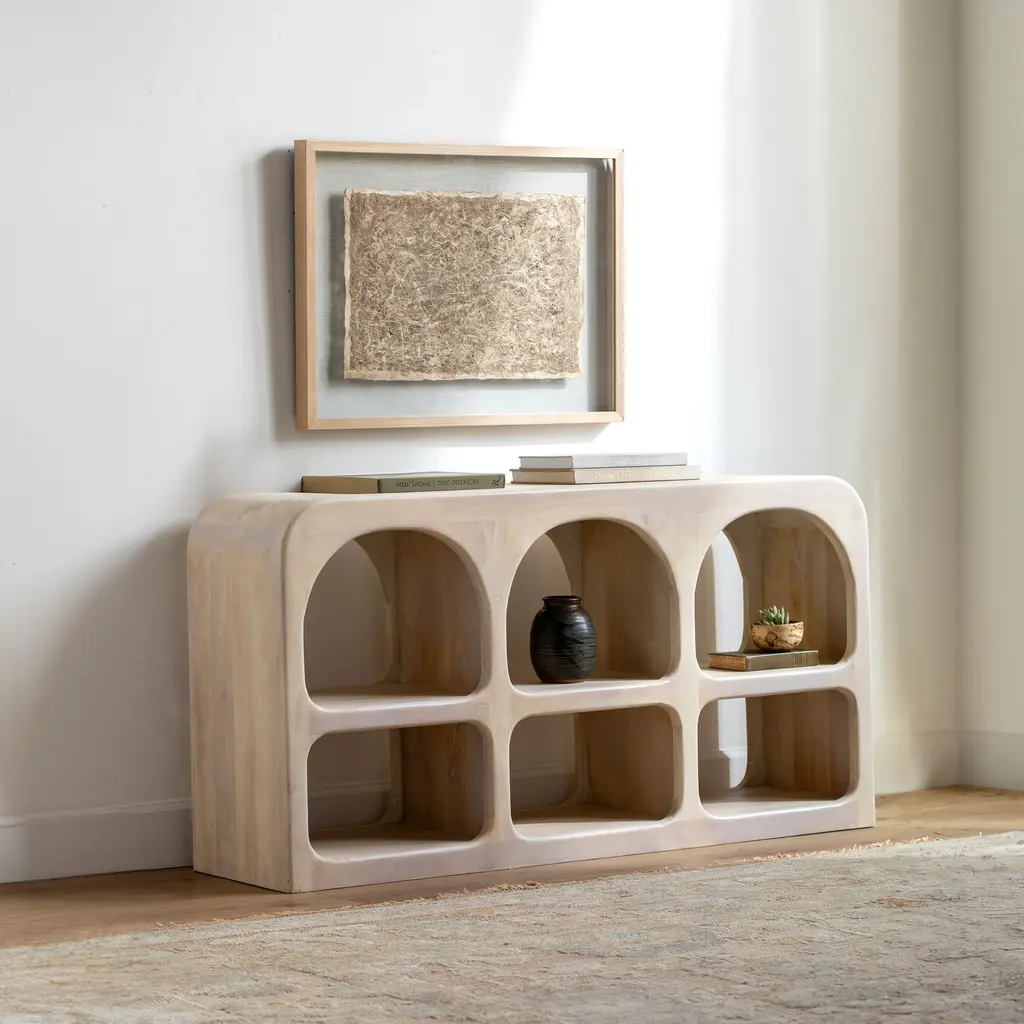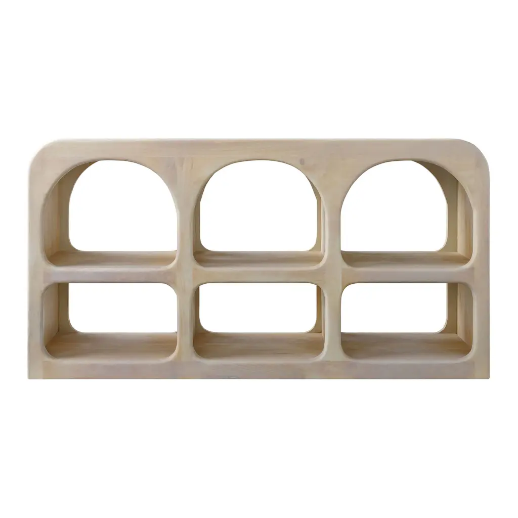 Masterfully crafted of ivory mango wood, the wide, short Panyer bookshelf features an enchanting arrangement of rectangular and arched shelf compartments. An artful storage solution with a boho-chic aesthetic, its open shelving invites you to decorate it with books and collectibles to create a captivating focal point. A compact fit for small bedrooms, offices, entryways and halls, this low and narrow piece doubles as a 6-compartment console table.