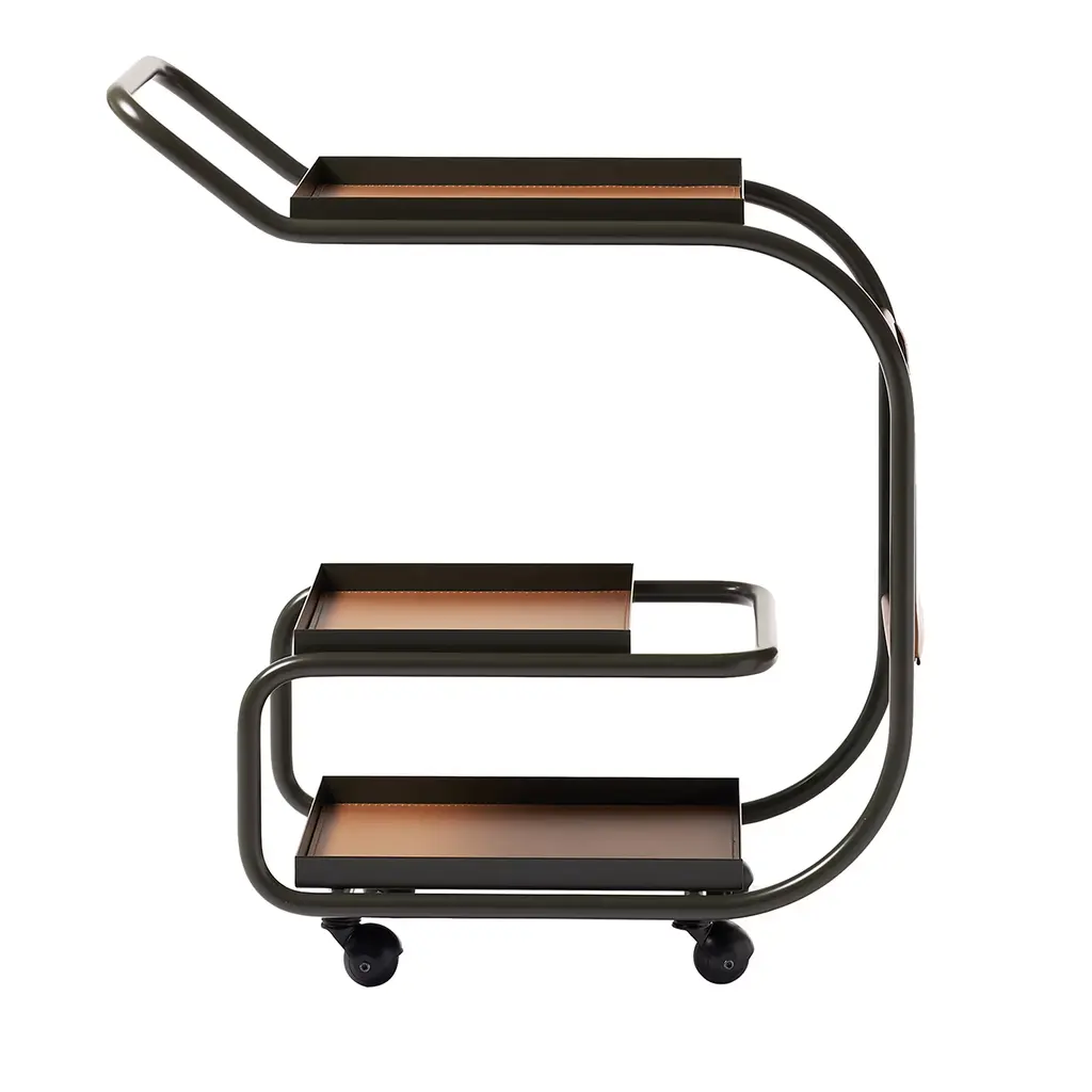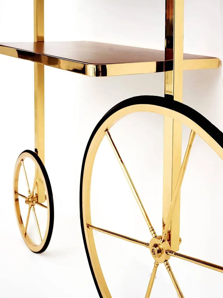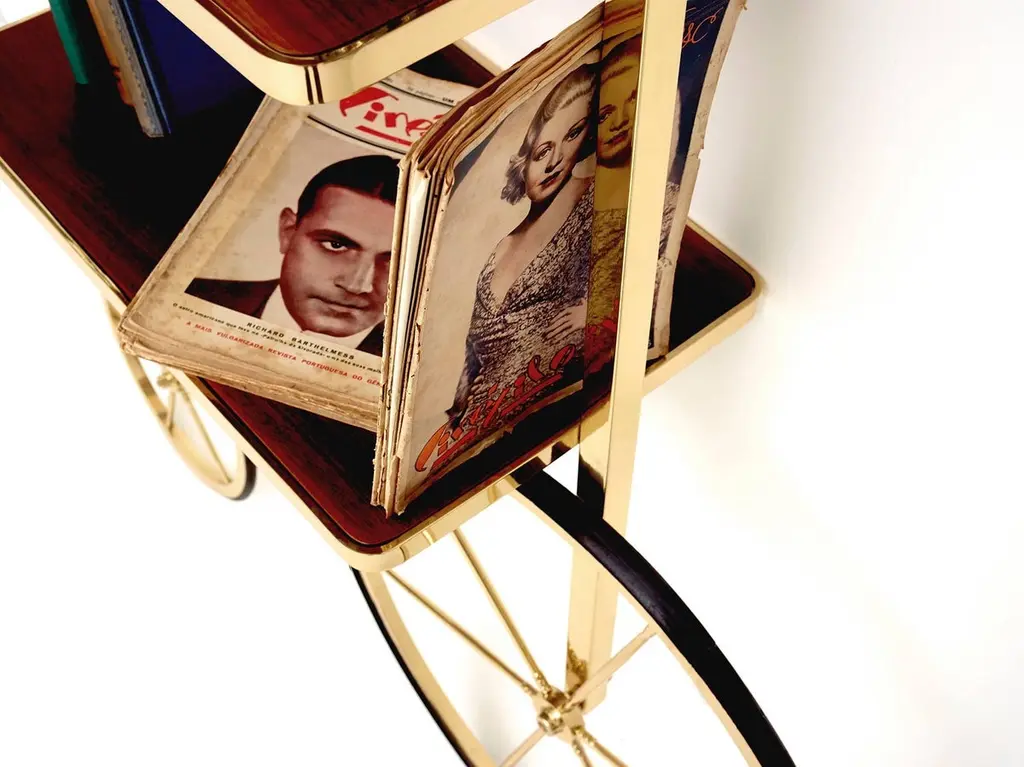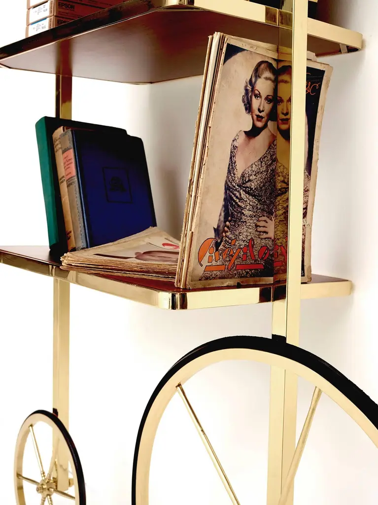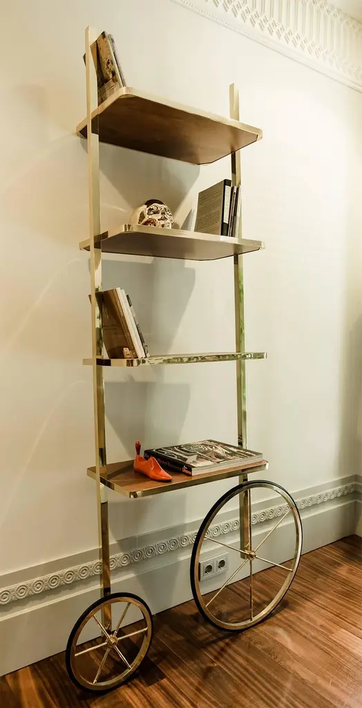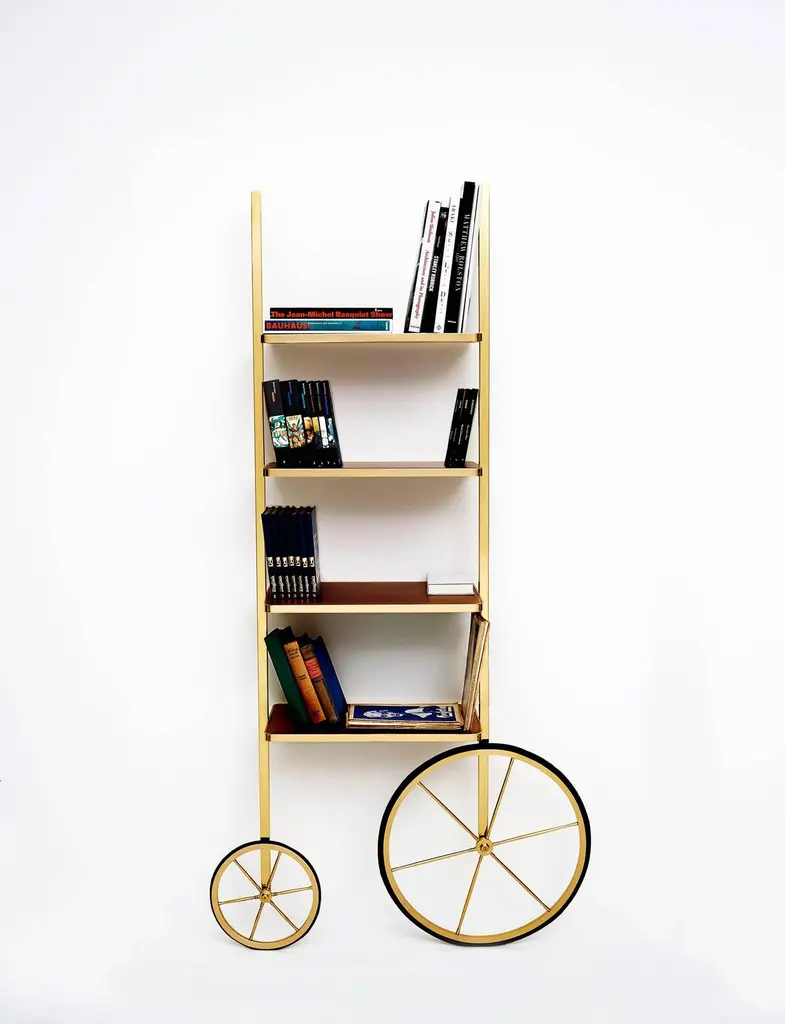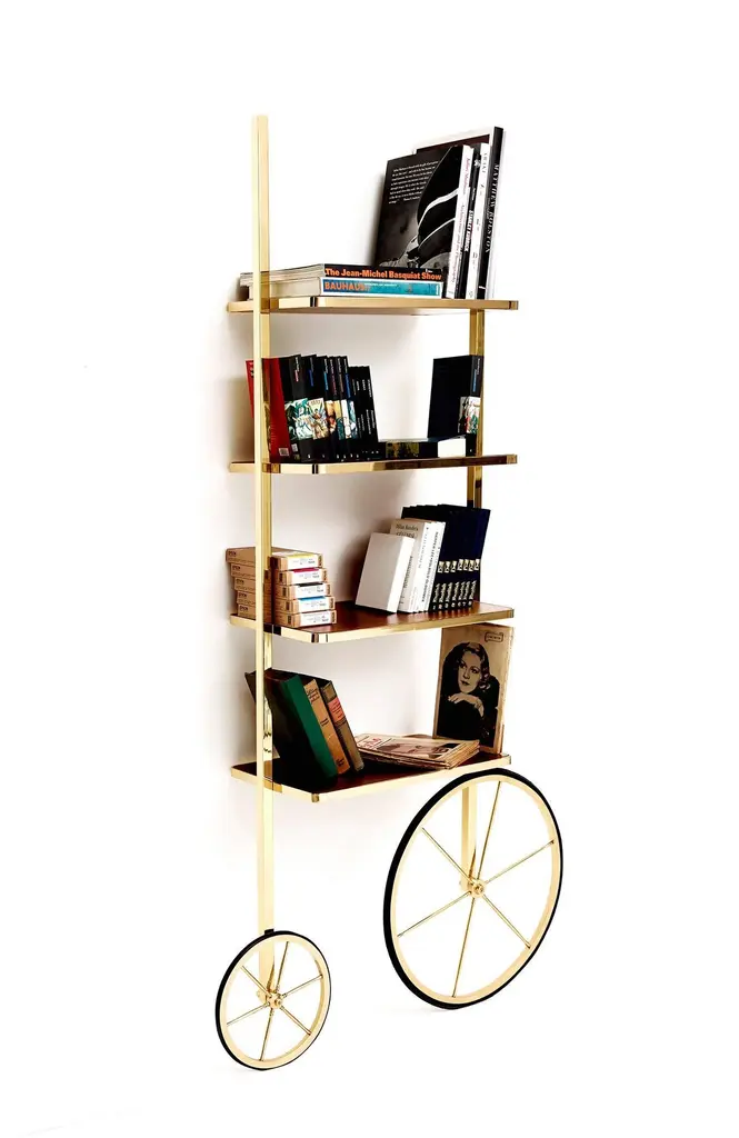 The design for Cyclopedia stems from the high wheel bicycles of the 1870s. Unlike most bookshelves, Cyclopedia differentiates itself through its portable structure. This unique piece is a library and a display shelf that can be wheeled and positioned in various locations around the space to meet the owners preference and purpose. Composed of polished brass and a rich mahogany, this handcrafted piece is sure to bring an eclectic vibe to any surface it leans against.