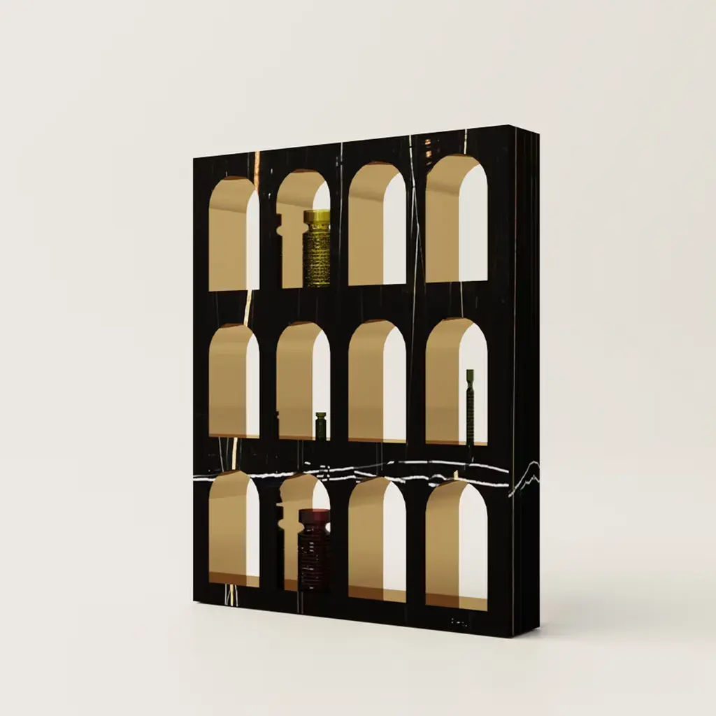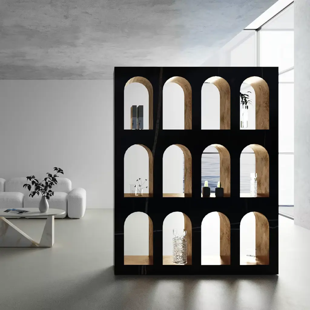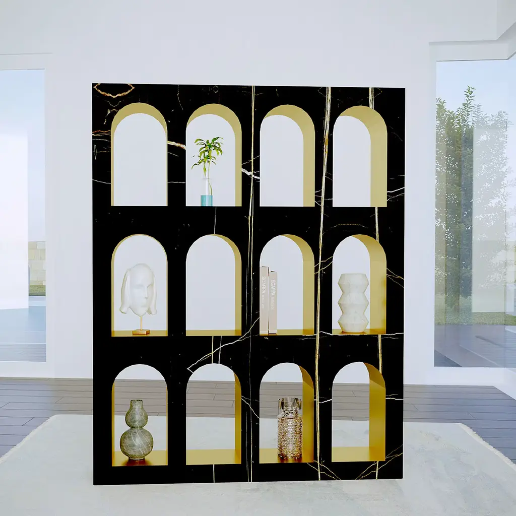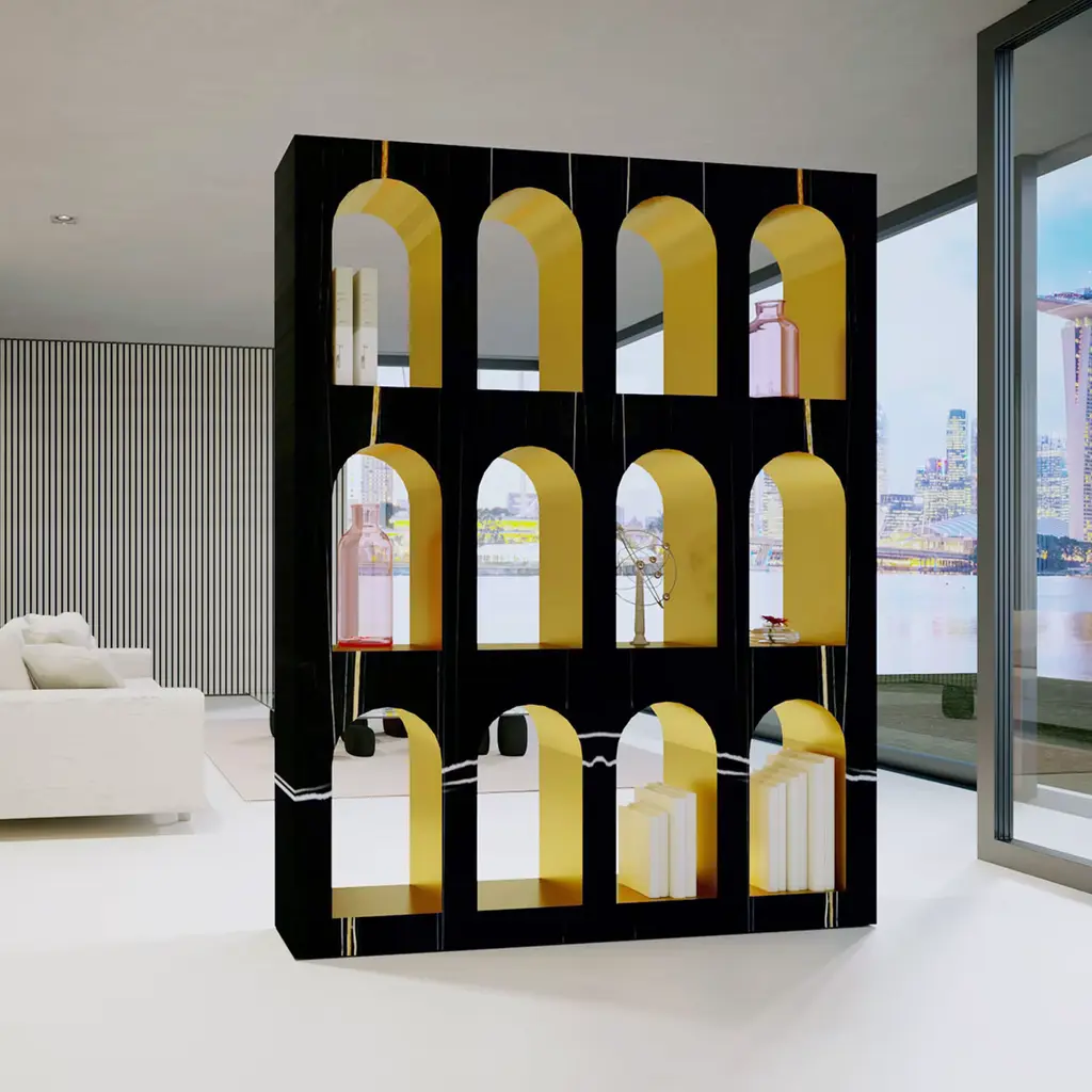 Showcasing the elegant gold and ivory veining of the Sahara Noir marble, the Portici Bookcase is a stunning addition to a luxurious decor. Either placed against a wall and freestanding to create a physical and visual division in a large room or loft space, this sophisticated bookcase inspired by the classic architecture showcases arched nooks enriched by a gold-finished interior. This flawless, singular design adds a sophisticated flair to the task of organizing and decorating with your most coveted collectibles and cherished pieces.