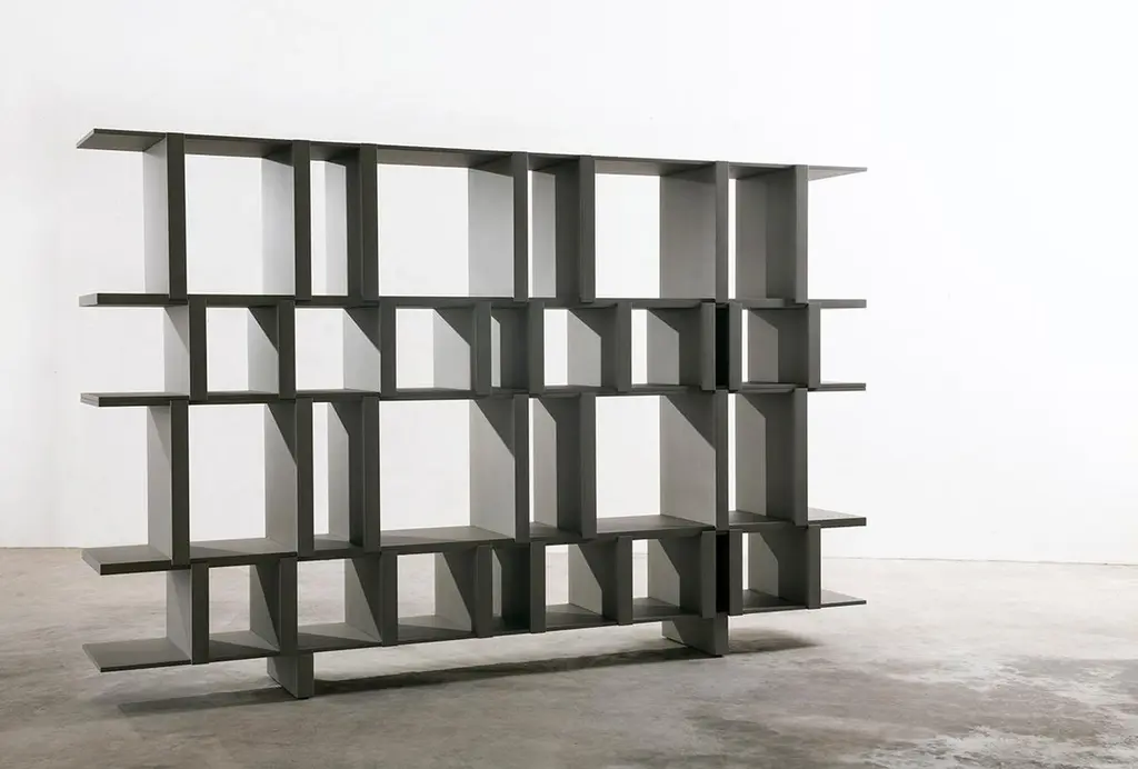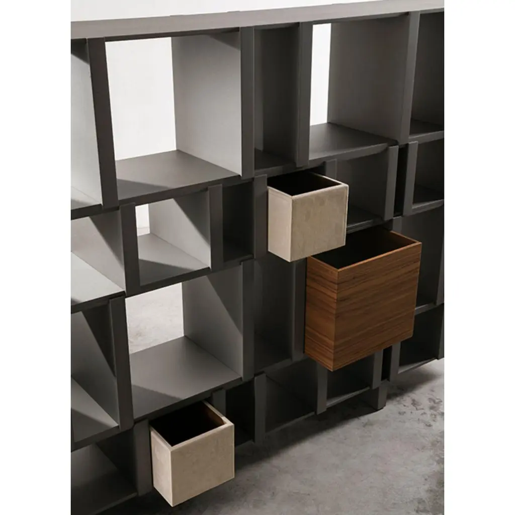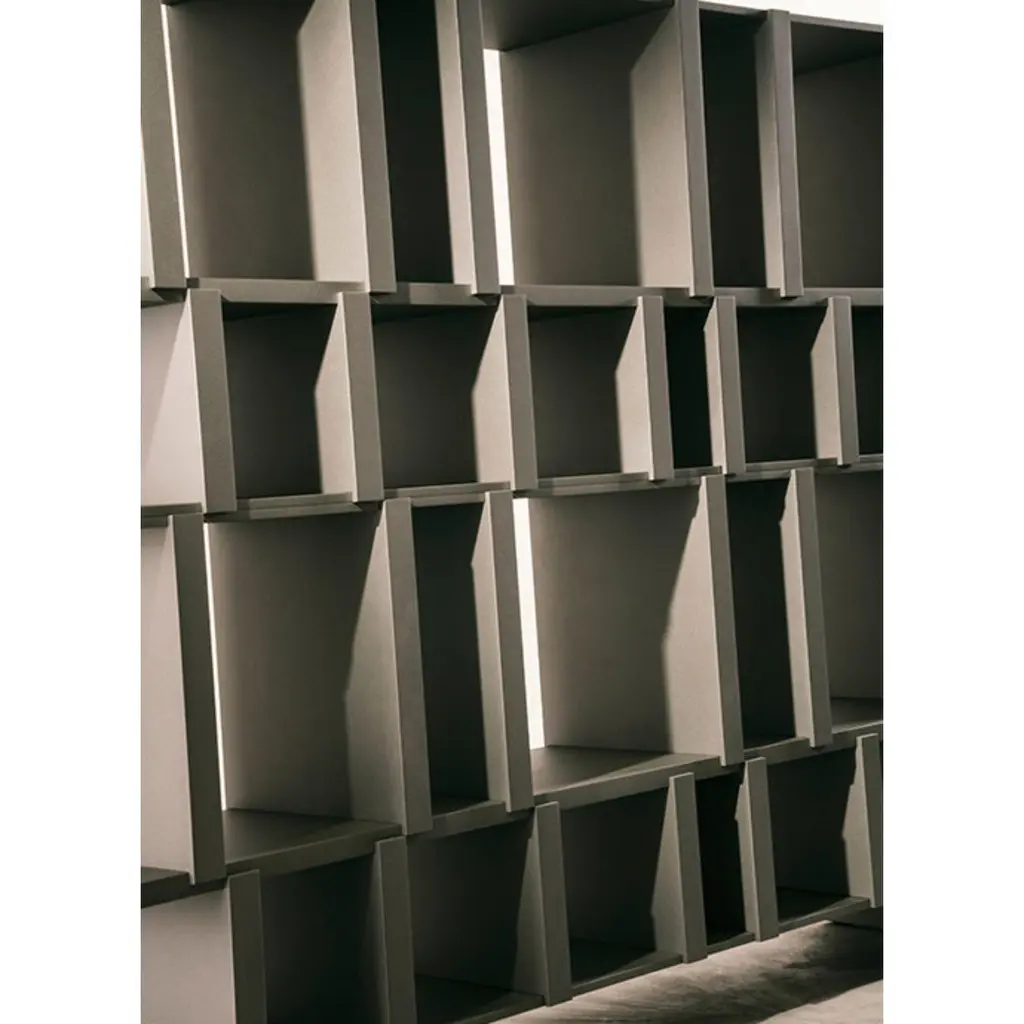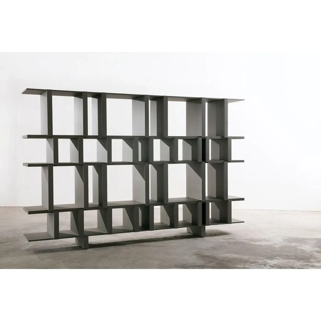 Pyrite vertical bookshelf by Luca NichettoMaterials: drawers: noce canaletto solid wood, leather. Structure: dark green / coral / nero ferro / light grey./ peltro lacquered multilayer wood.Dimensions: W 59 x D 31.6 x H 200 cm.Inspired by optical illusion artworks, the design of Pyrite bookshelf amazes through an unexpecteddistribution between empty and full spaces and a structure where horizontal and vertical seems to bereversed.The thin lines of the frame aim for invisibility while contrasting the thicker dividers, in an unusualcombination of thicknesses. The different size and shapes of the sections combine to give a sense ofmovement, while drawers in leather or wood can be added to the bookshelf.Pyrite can be used as a single module with two shelves, functioning as a standing alone piece, orit can be combined with others horizontally so to create a larger bookshelf system or either repeatedvertically, to cover the length of entire walls. Italian designer Luca Nichetto is the Art Director of La Manufacture.Born in Venice in 1976, he studied there at the IUAV, the Venice University Institute of Architecture, from which he graduated in industrial design. In 1999, he started his career designing his first projects for Salviati using Murano glass.He went on to collaborate with Foscarini as a designer and consultant. In 2006, he establishedhis own studio in Venice, which specialised in industrial design and design consulting. Five yearslater, in 2011, Nichetto opened a second studio in Stockholm, Sweden, where he now works andresides.Throughout his career, Nichetto has served as Art Director for a number of international design brands.
