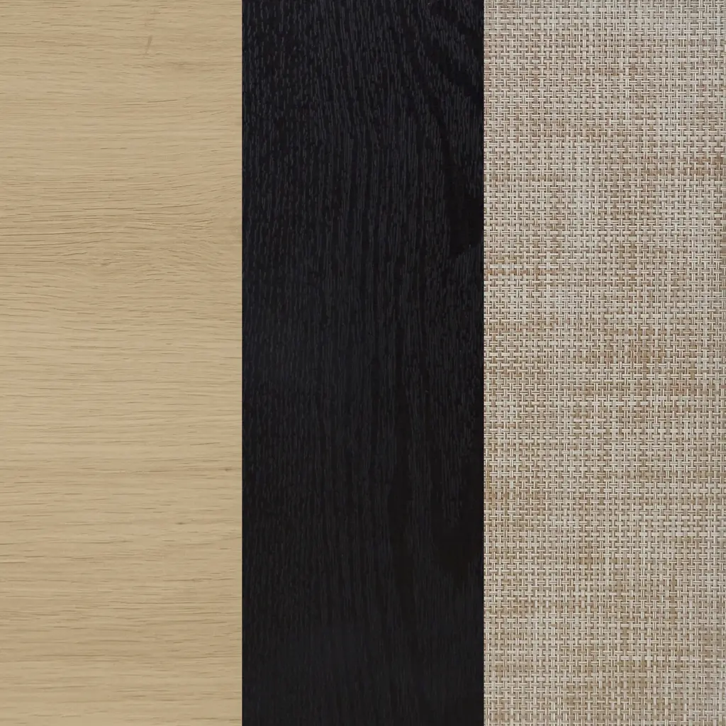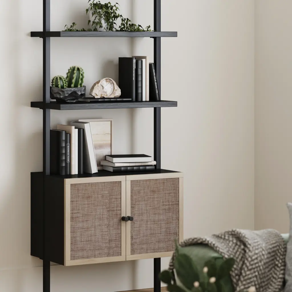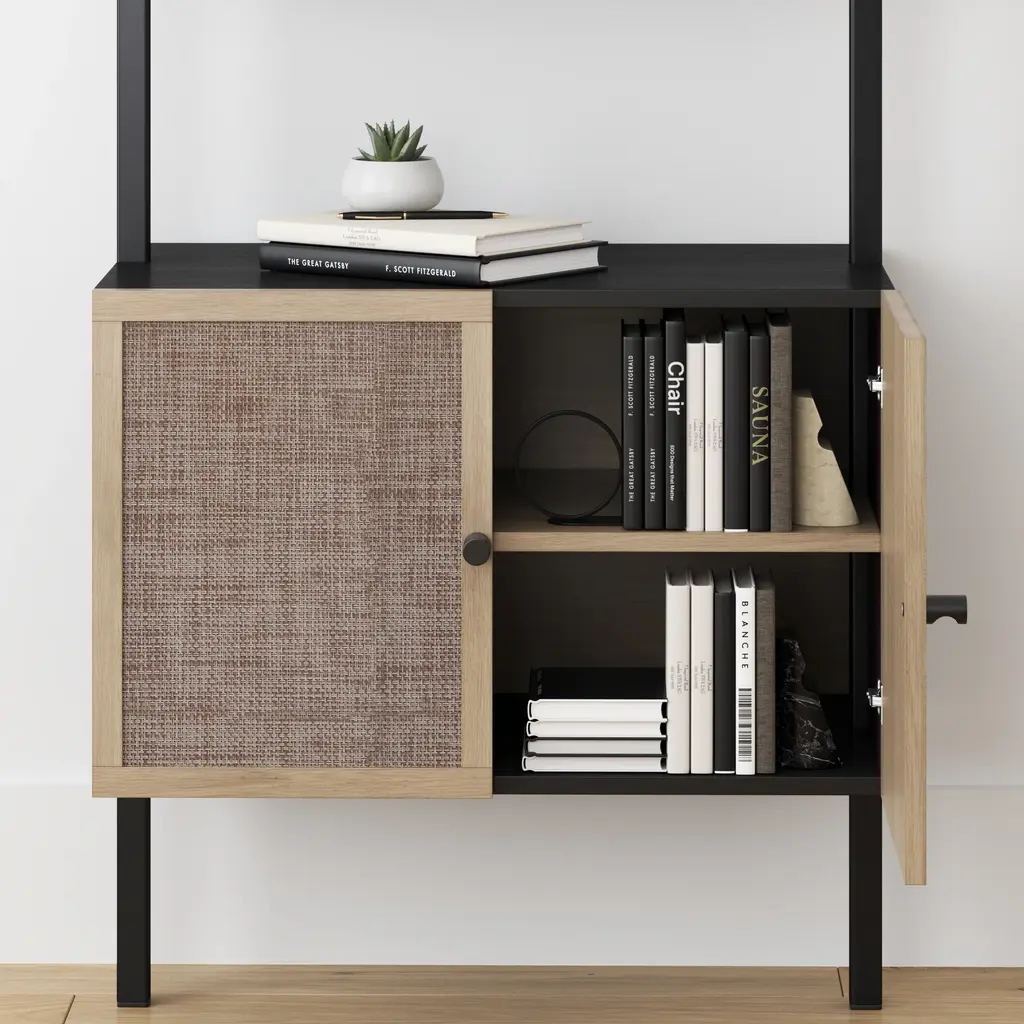 A breezy boho bookcase with storage. Sporting oak laminate shelves and body that frames 2 stunning cane doors made from natural rattan. Supported by durable metal legs with a beautiful matte black finish. All mounting hardware is included for easy installation. The Theo Storage Bookcase is an instant sensation that makes a design statement and provides a storage solution.