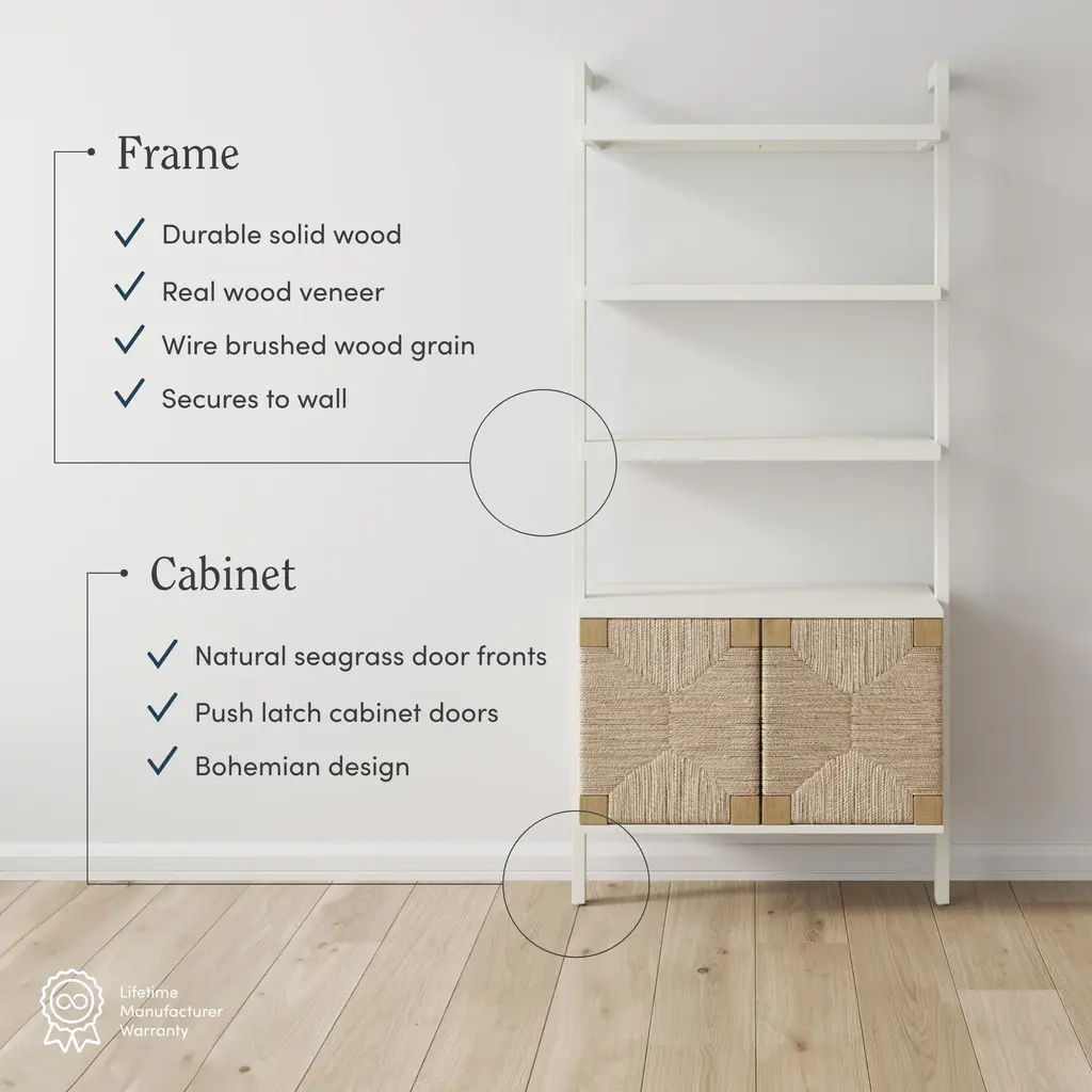 Our Beacon collection is growing. Meet the Beacon Bookshelf in a stunning warm white finish. Hand-woven natural seagrass door fronts add texture, while the sturdy wood construction ensures it will stand the test of time. This bookshelf is our go-to for timeless organization, featuring open shelving to display your cherished trinkets and closed storage with push latch cabinet doors to tuck away items you prefer hidden. Embrace the cozy warmth of the wire-brushed wood grain, and rest easy knowing it can be securely installed on your wall to eliminate any tipping hazards.