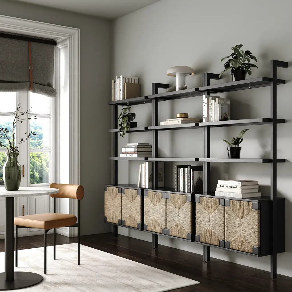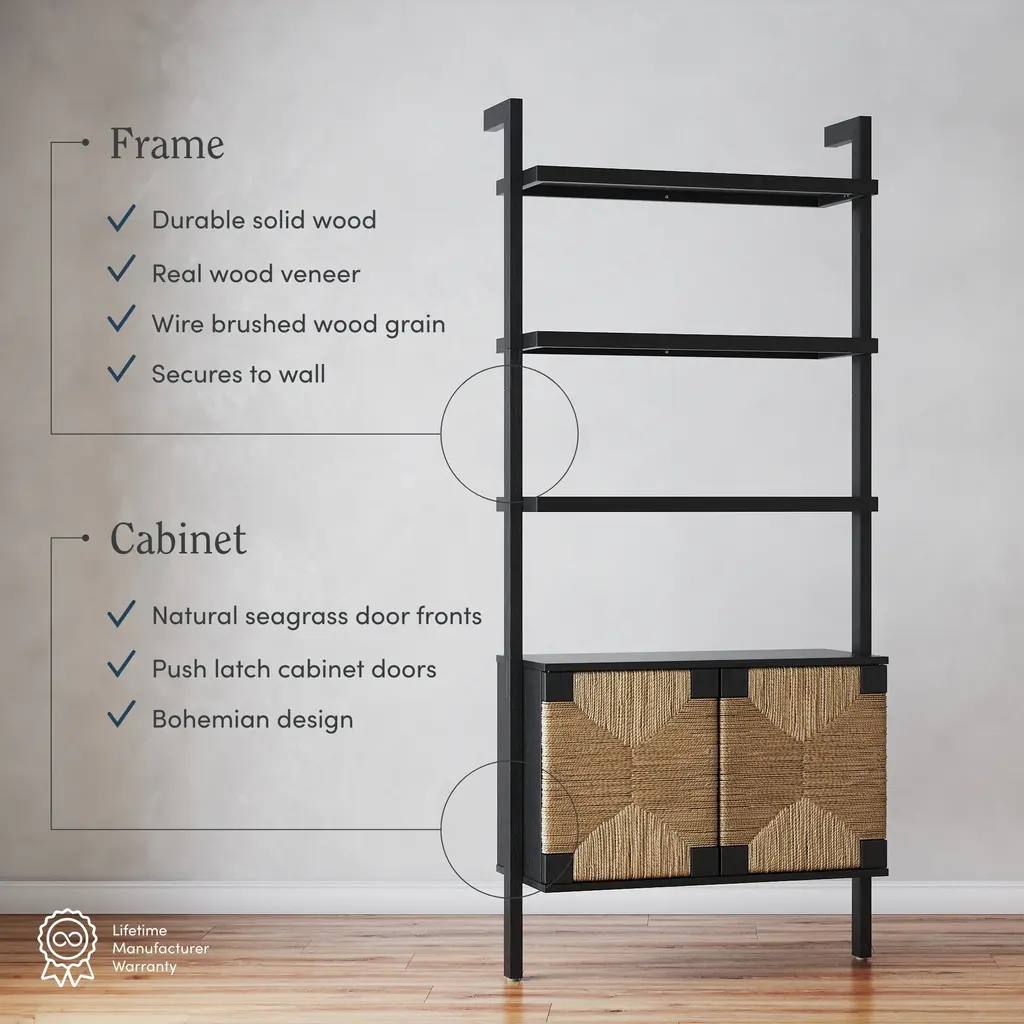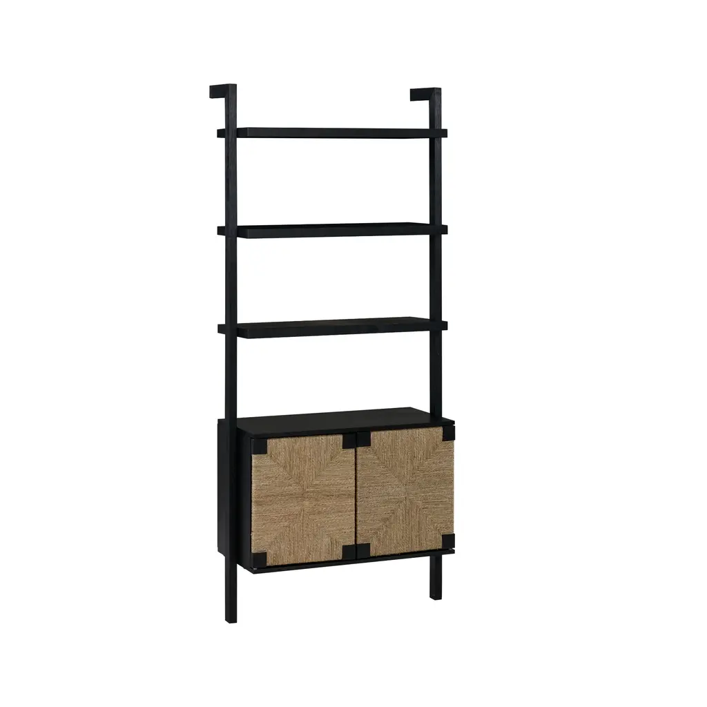Our Beacon collection is growing. Meet the Beacon Bookshelf in a wire-brushed black finish. Hand-woven natural seagrass door fronts add texture, while the sturdy wood construction ensures it will stand the test of time. This bookshelf is our go-to for timeless organization, featuring open shelving to display your cherished trinkets and closed storage with push latch cabinet doors to tuck away items you prefer hidden. Embrace the cozy warmth of the wire-brushed wood grain, and rest easy knowing it can be securely installed on your wall to eliminate any tipping hazards.