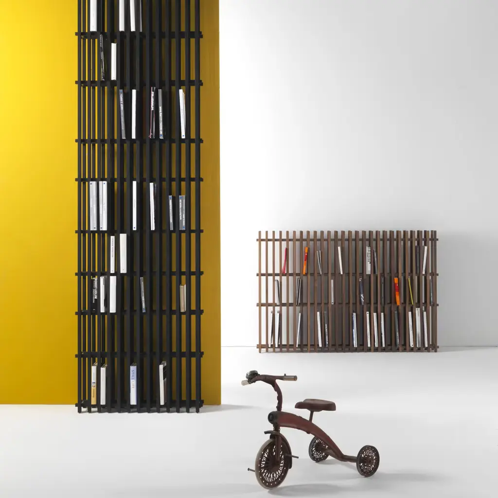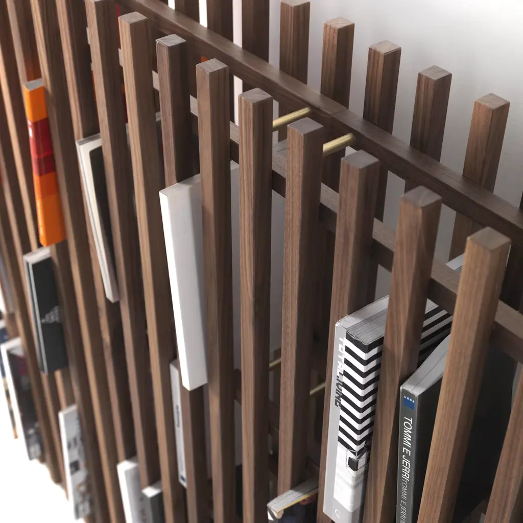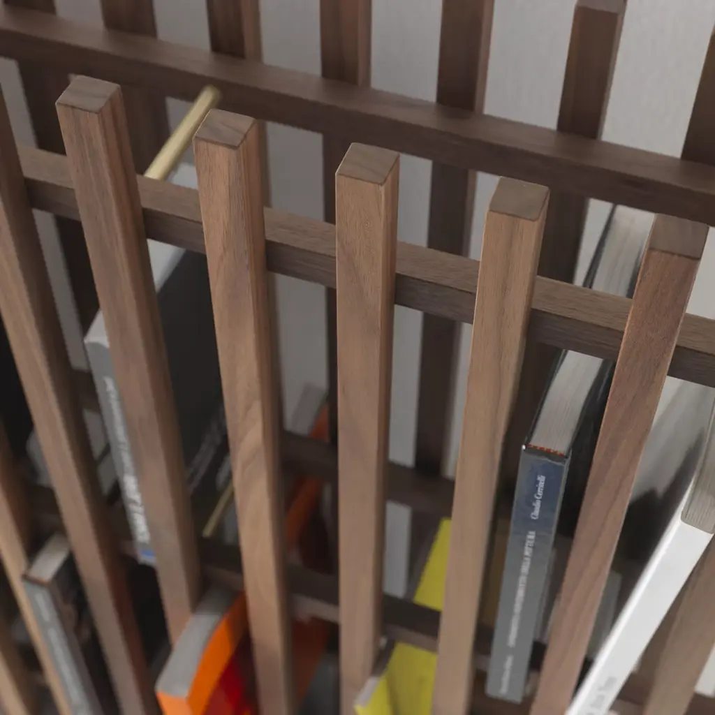 Minimalist and sophisticated, this bookshelf can be directly put on a wall or in the middle of a room as a divider. Its light silhouette and exquisite craftsmanship make it a striking piece of functional decor that recalls the facade of a building, a three-dimensional boiserie. Entirely made in canaletto walnut, this piece is comprised of two vertical panels that frame four horizontal shelves. Its versatile shape can have different heights and can be made also in natural durmast oak or durmast painted black. Please consult the concierge about possible changes in price for customization.
