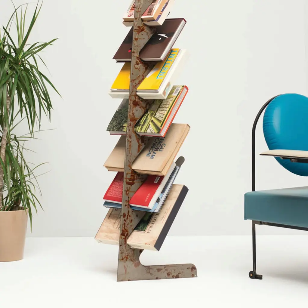 The structure of the Spino is created from a laser-cut bent iron sheet. The iron itself is hand treated with a special oxidized finish, and is available in matte or glossy finish. When used as a bookshelf, the books are displayed so that the cover and the title side are always clearly visible. The Spino can also be used as a coat rack.All the pieces of the collection are handmade by artisans in the Milan area of Italy in respect of the local craftsmanship tradition.