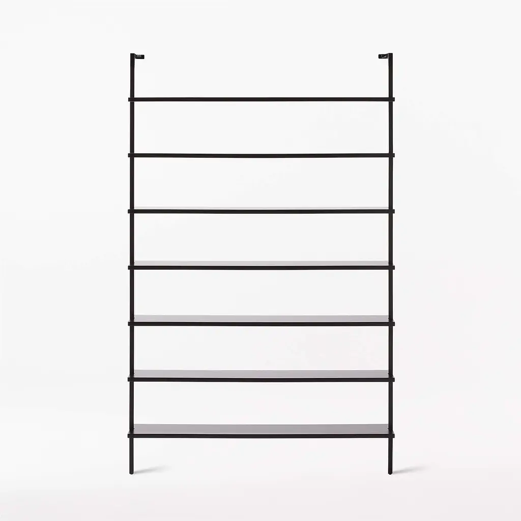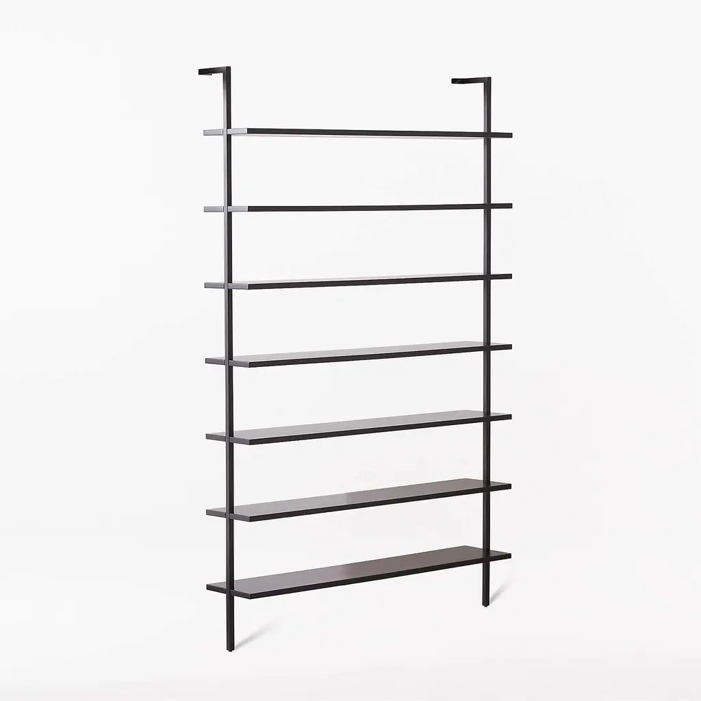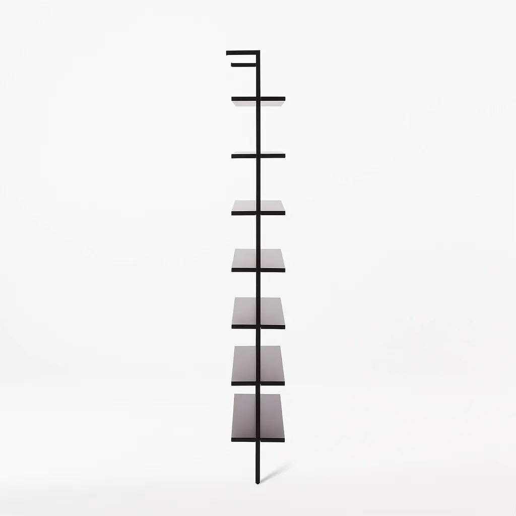 Our best seller goes wide in sleek, modern black. Seven shelves ladder up in black-lacquered engineered wood while a powdercoated aluminum frame hides hardware expertly. Mounts sturdy to the wall and creates a vertical library in multiples. CB2 exclusive.