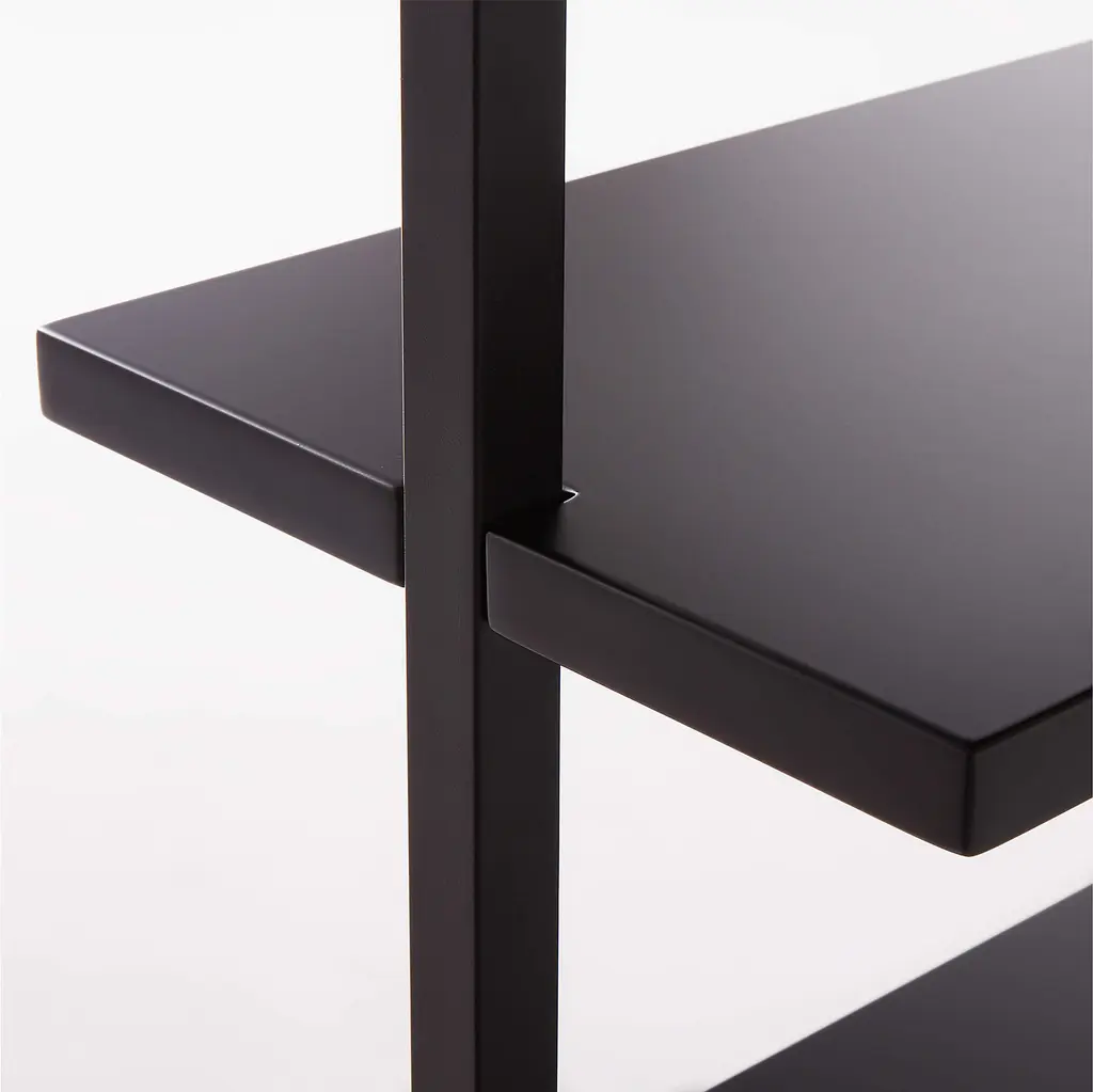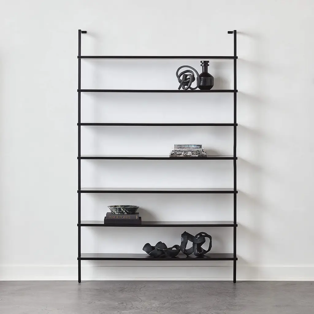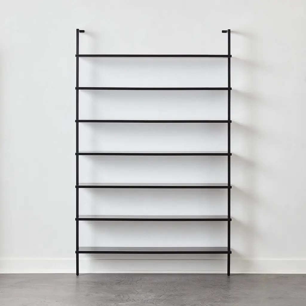 Our best seller goes wide in sleek, modern black. Seven shelves ladder up in black-lacquered engineered wood while a powdercoated aluminum frame hides hardware expertly. Mounts sturdy to the wall and creates a vertical library in multiples. CB2 exclusive.