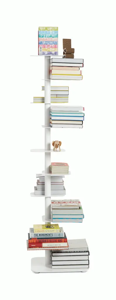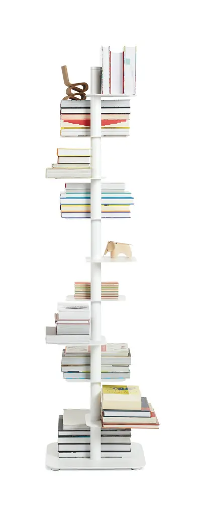 By holding texts horizontally in a vertical stack, Story holds dozens of books in a very compact footprint. "It was not an easy task, though it appears really simple," says Hung-Ming. "We hope people see it as a quiet, functional sculpture." All-metal construction and a heavy weighted base provide strength and stability. Made in China. Create a forest of book trees. Mix and match the two heights to create a library unlike any other. Weight limit per shelf: 7 pounds. Ships in two boxes for easy handling. Simple assembly required. wall anchoring hardware and safety strap included.