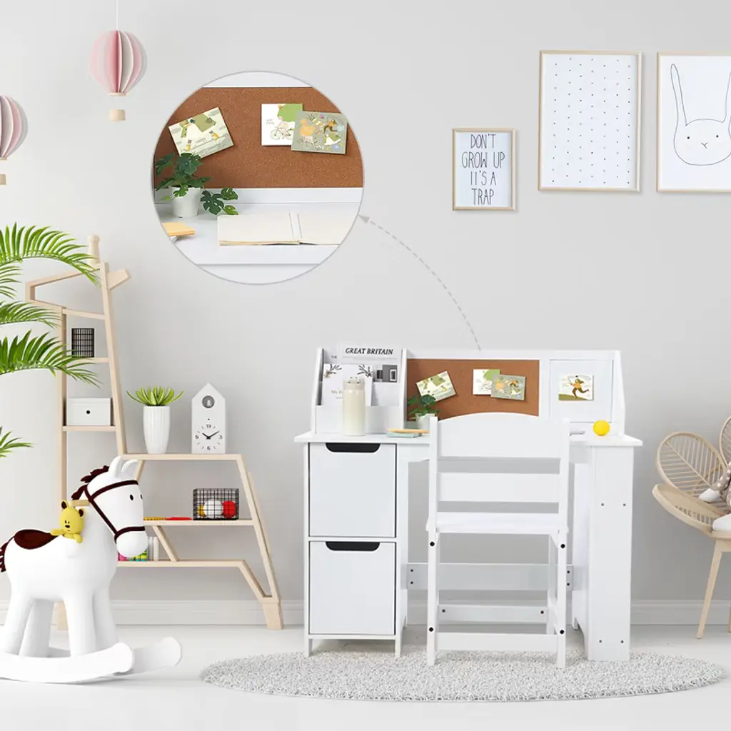 Product DescriptionKids Study Desk & Chair Set with Bookshelf & Bulletin Board - White Writing Table, Storage Cabinets, for Ages 3-8, PinkProduct informationItem Weight: 52.9 poundsTable: 33.9 "(H) X 37"(L) X 17"(W)Chair: 27" (H) X 15.4" (L) X 12.6" (W)Color: WhiteBase Material: WoodTop Material Type: WoodPackage List1 x Table1 x Chair