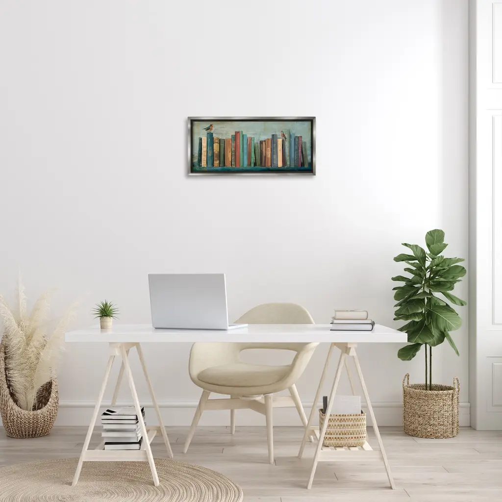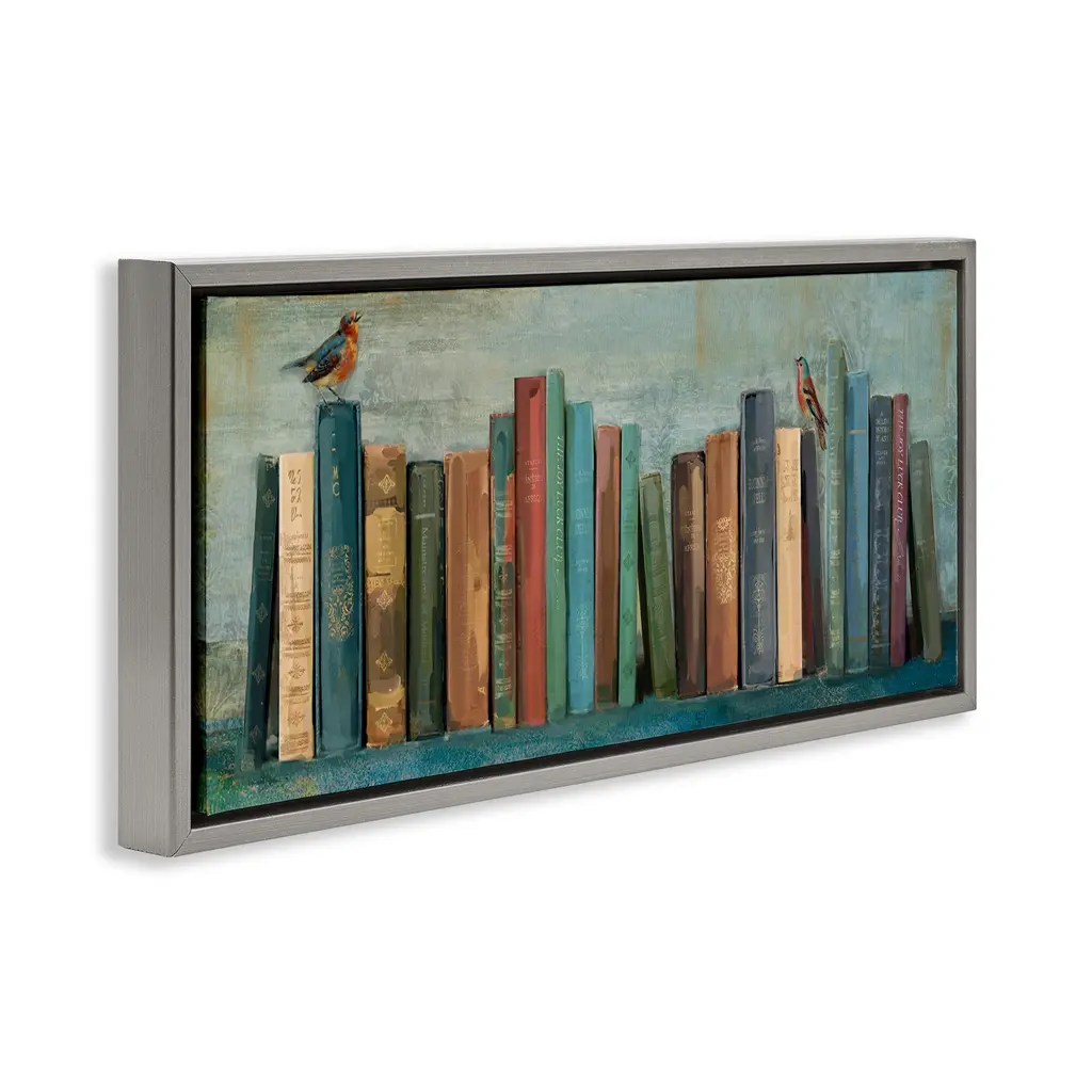 Elevate your home or office to the next level with Stupell Framed Floating Canvas Wall Art. Our premium hand-stretched canvas is mounted securely into a sturdy lightweight frame. The museum-style gap between the wrapped canvas and the box frame gives the illusion of floating artwork. Stupell Wall Art is made in the USA.Features: Dimensions: 25 x 1.7 x 11 Frame, 24 x 1.5 x 10 Canvas ArtFloating Frame Canvas Products are available in sizes 25"x11" and 31"x14". All Floating Frame Canvas Products have a 1.7" Depth.Wall Art is Ready to Hang with Hardware Free Hanging. No Installation required. For Easy Set Up Lean or Layer Artwork on Shelf or Against Wall. Artwork is Permently Fixed into the Frame.Our elevated 1.7" Thick Floating Frame is the perfect complement to our canvas style Wall Art. We use only the highest quality inks in house with industry leading printing solutions. Canvas is hand stretched over a durable wood foundation and then mounted securly into a Modern Box Frame. Made in the USA.Artwork Relates To: Bird, Books, Bookshelf, Reading, Bookworm, Still LifeDesign by Main Line Studio