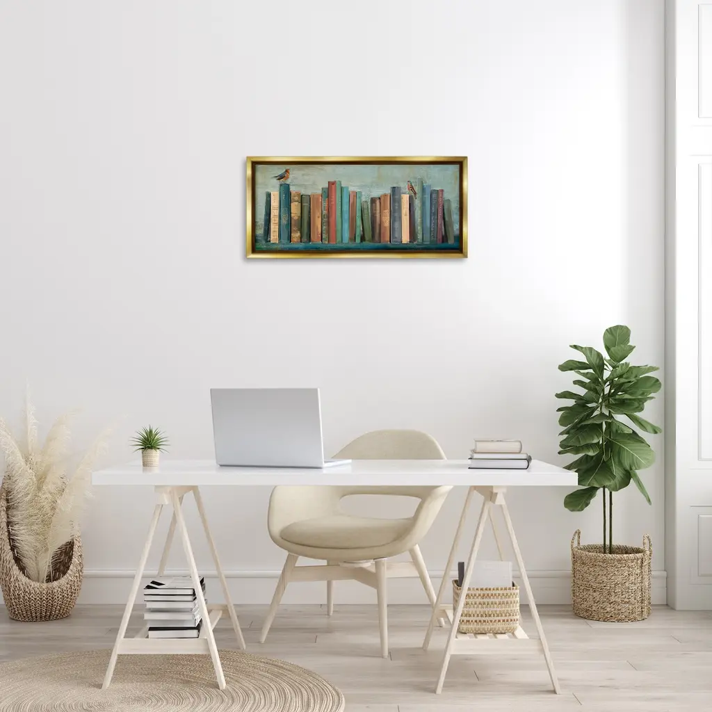 Elevate your home or office to the next level with Stupell Framed Floating Canvas Wall Art. Our premium hand-stretched canvas is mounted securely into a sturdy lightweight frame. The museum-style gap between the wrapped canvas and the box frame gives the illusion of floating artwork. Stupell Wall Art is made in the USA.Features: Dimensions: 25 x 1.7 x 11 Frame, 24 x 1.5 x 10 Canvas ArtFloating Frame Canvas Products are available in sizes 25"x11" and 31"x14". All Floating Frame Canvas Products have a 1.7" Depth.Wall Art is Ready to Hang with Hardware Free Hanging. No Installation required. For Easy Set Up Lean or Layer Artwork on Shelf or Against Wall. Artwork is Permently Fixed into the Frame.Our elevated 1.7" Thick Floating Frame is the perfect complement to our canvas style Wall Art. We use only the highest quality inks in house with industry leading printing solutions. Canvas is hand stretched over a durable wood foundation and then mounted securly into a Modern Box Frame. Made in the USA.Artwork Relates To: Bird, Books, Bookshelf, Reading, Bookworm, Still LifeDesign by Main Line Studio