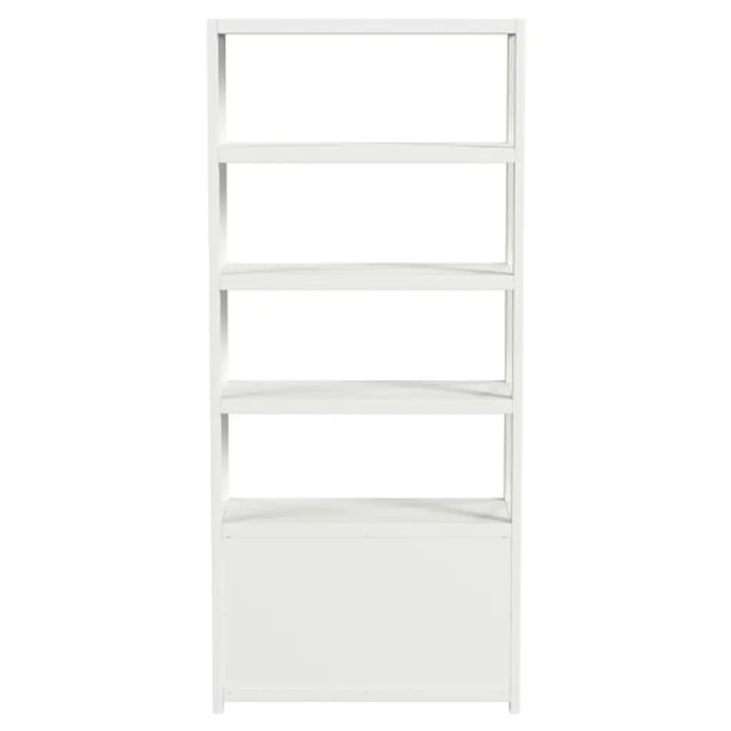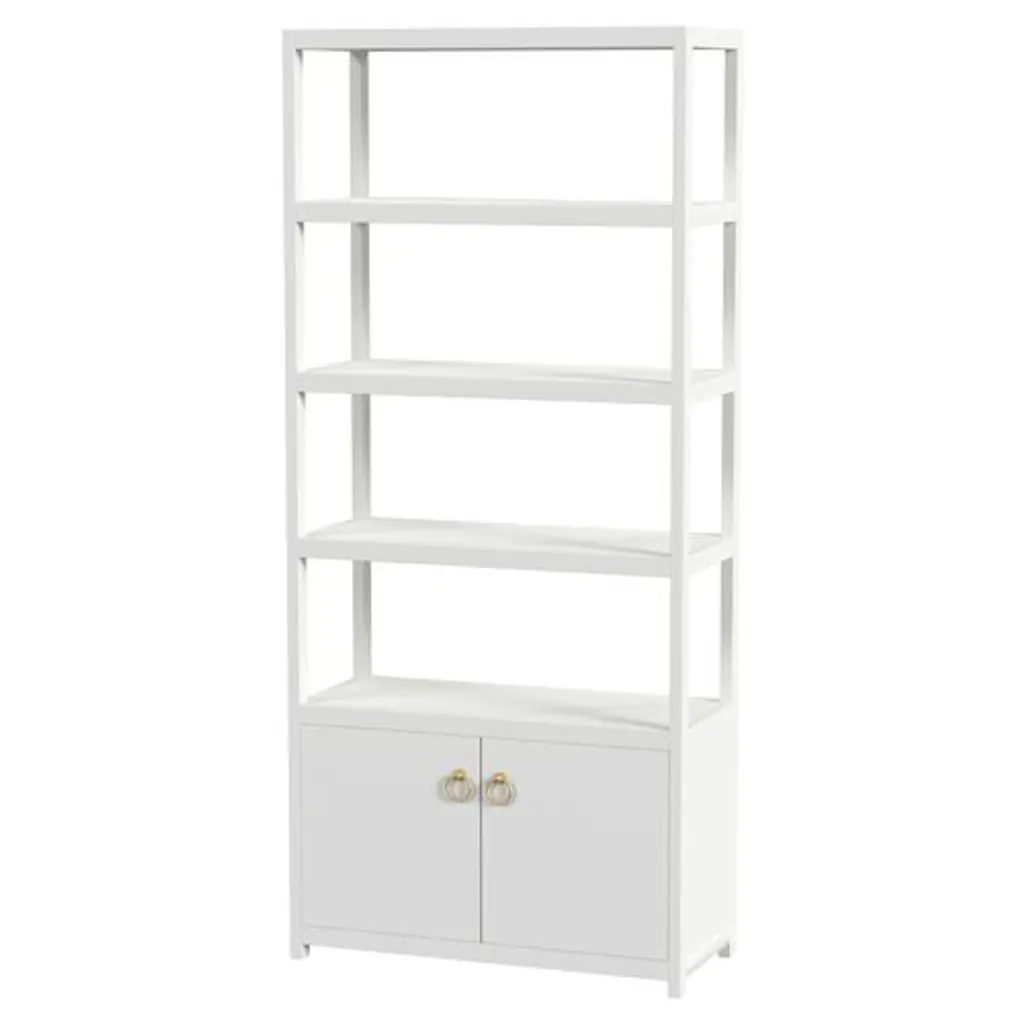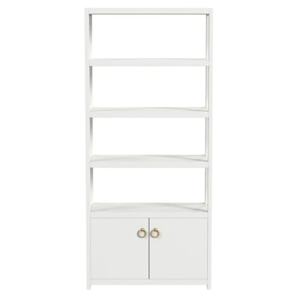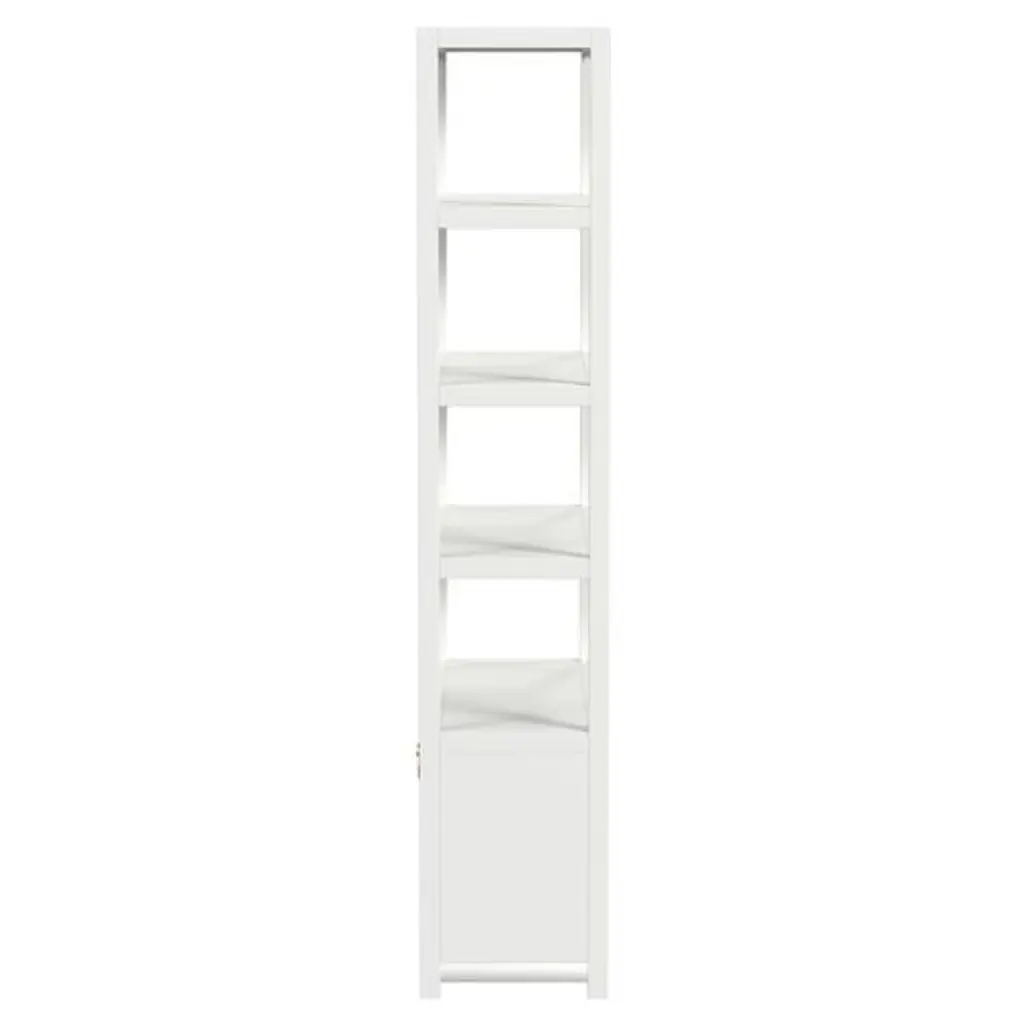 This clean-lined étagère is a welcome addition to just about any style of room. Below the four open shelves is a cabinet for hidden storage. The golden door pulls complement the crisp white finish.