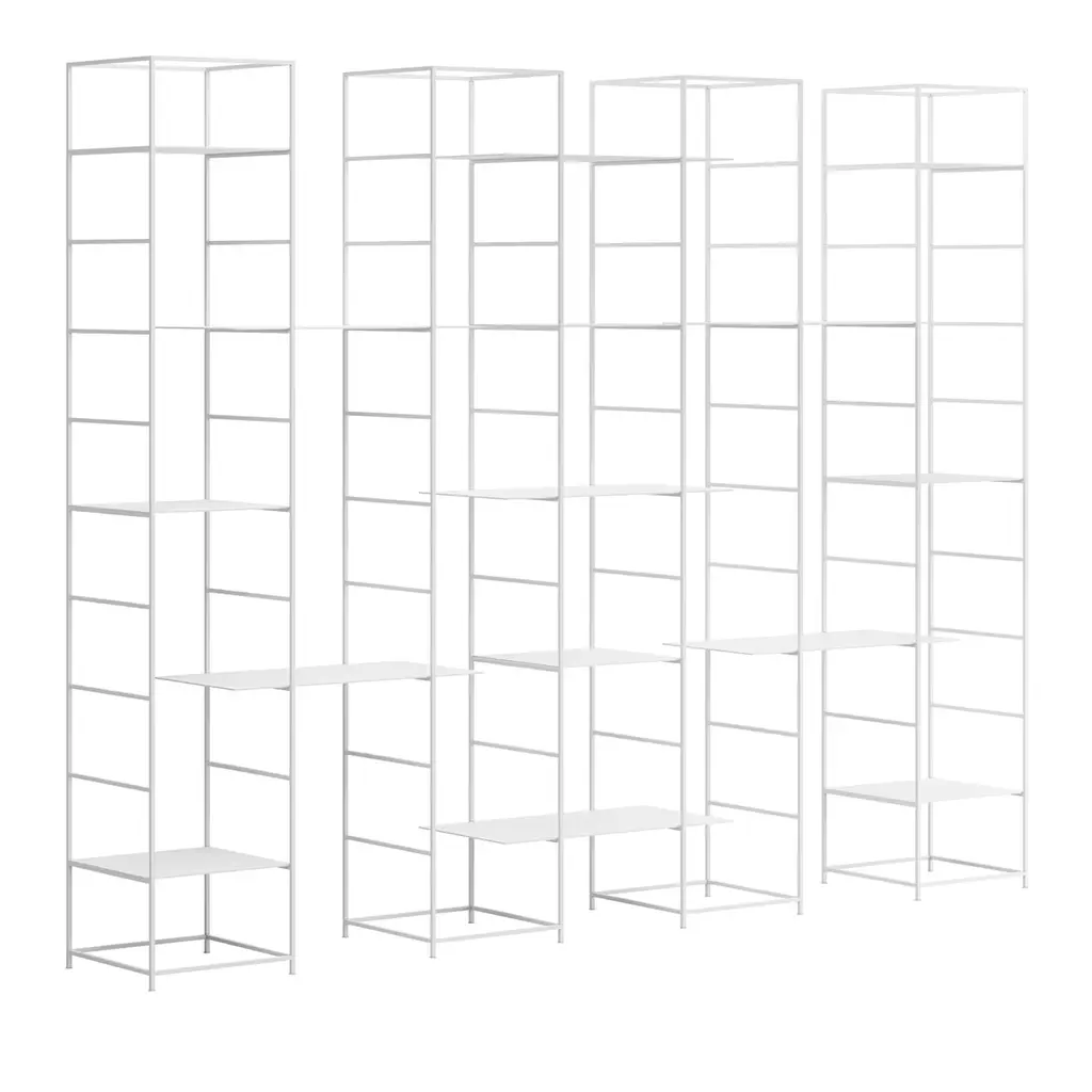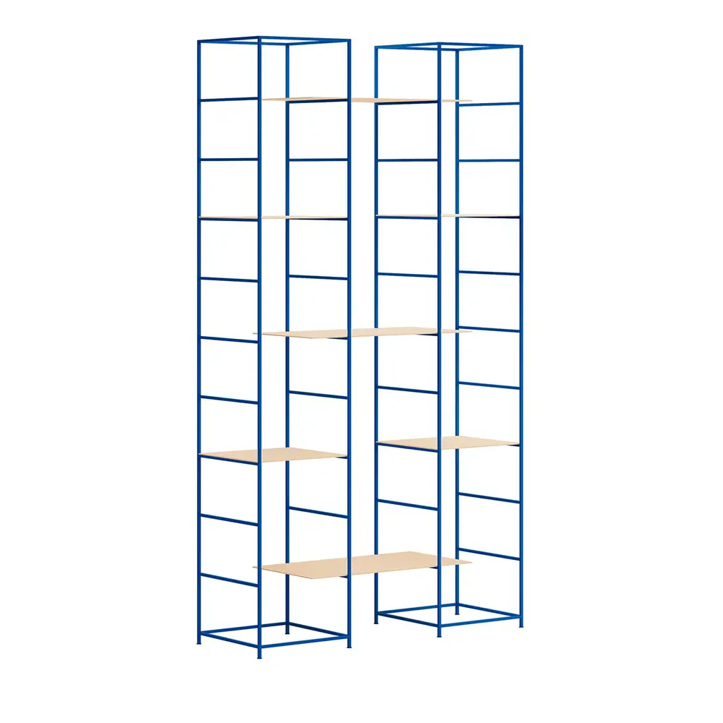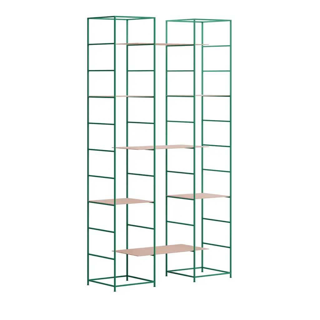 Merging industrial design with modular elegance, this bookshelf features a sleek, powder-coated iron frame that defines its versatile aesthetic. Composed of two columns, it includes smaller and larger shelves, each available in a range of colors to suit various styles. Its robust structure and clean lines enable flexible arrangements, perfect for displaying books, art, and decor. This piece brings a refined contemporary touch to any space, combining practicality with visual presence.