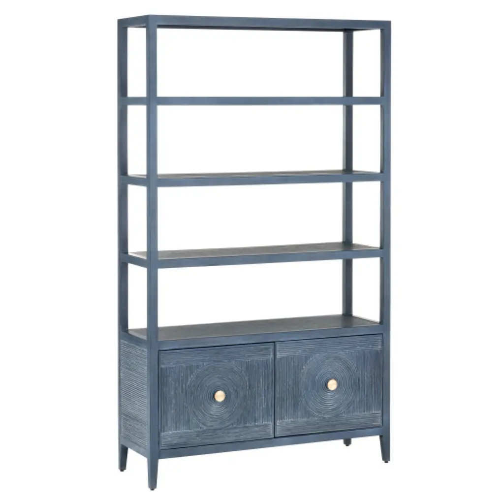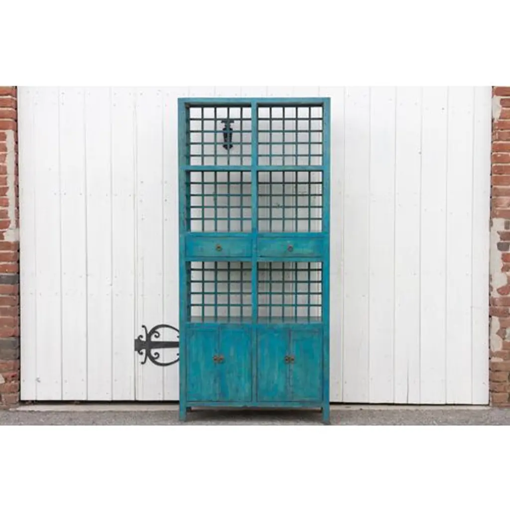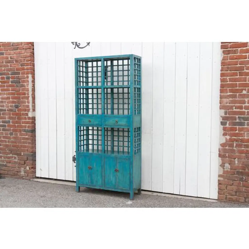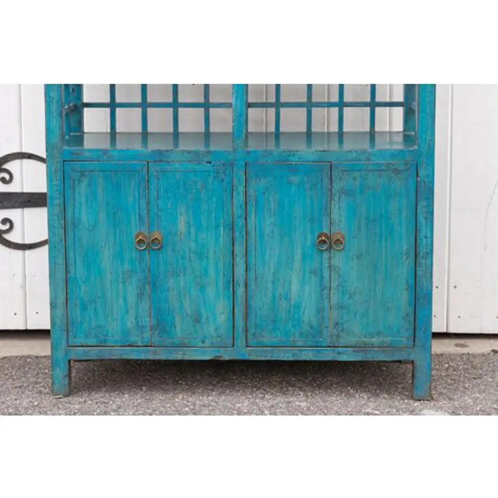 A colorful Chinese bookshelf cabinet with a beautiful lacquered painted blue finish. The tall bookcase has two drawers in the center with four doors a the bottom and three shelves. This colorful modern bookcase has a traditional lattice openwork design on the sides and back.