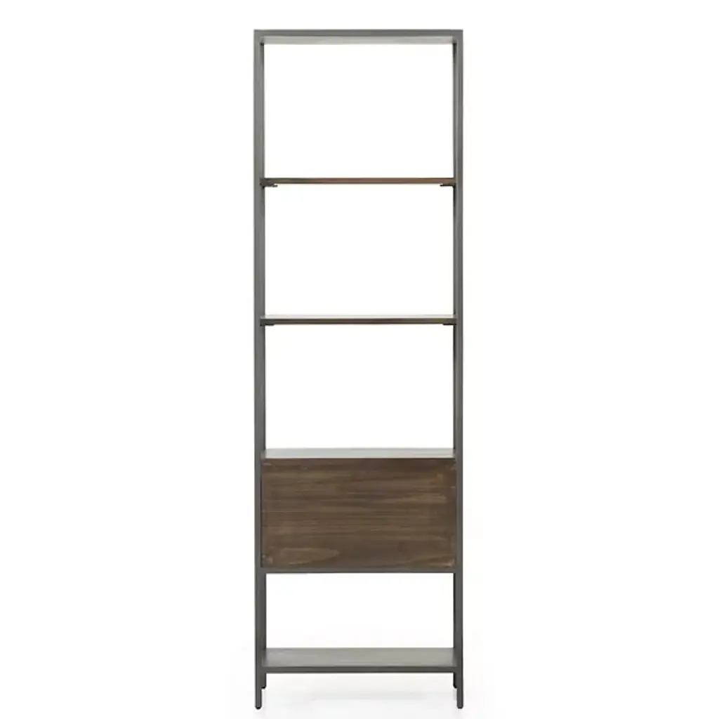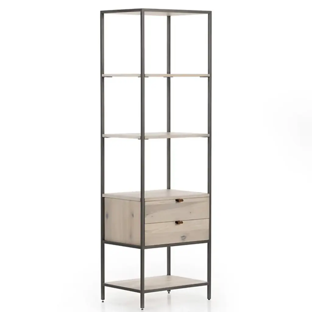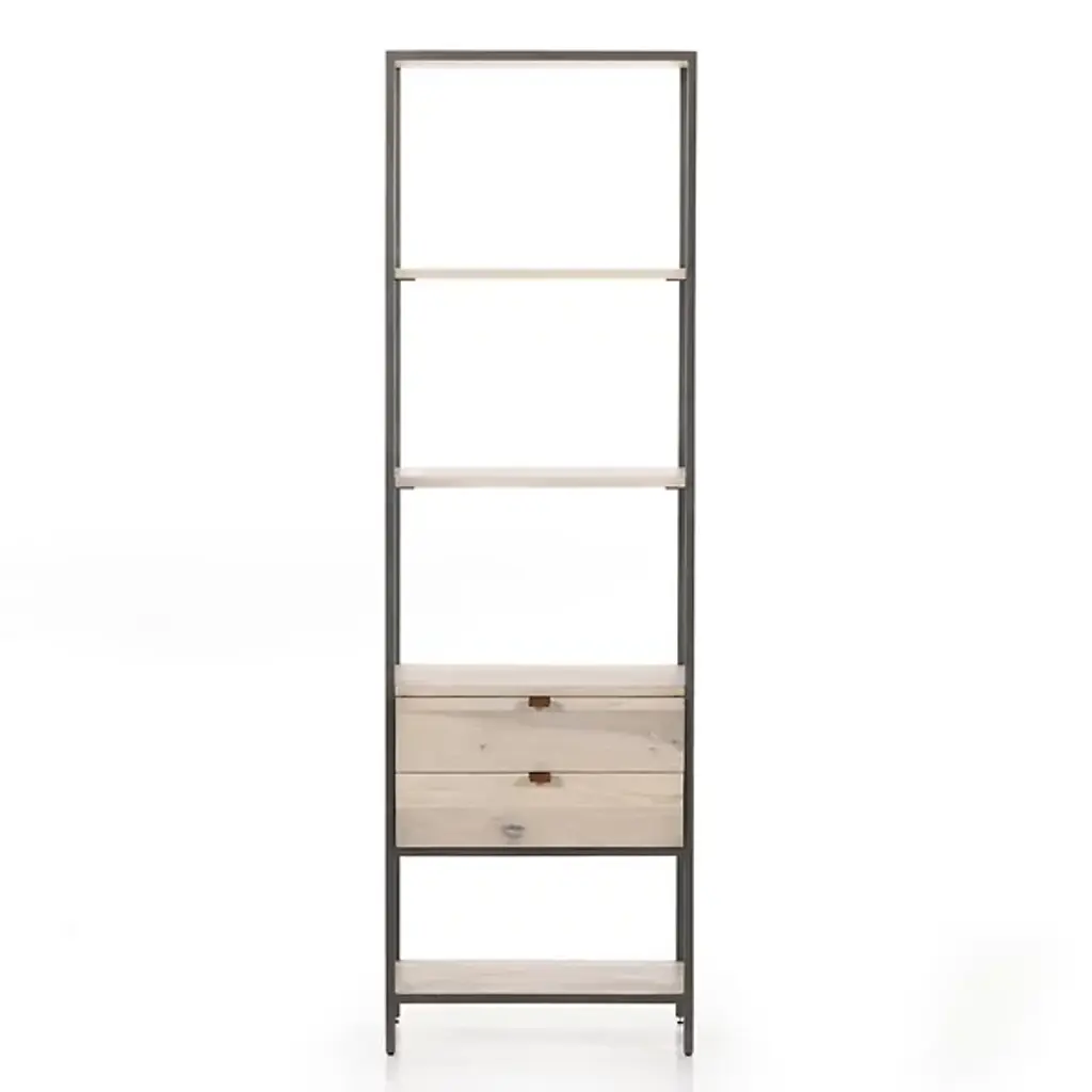 The Trey Bookshelf from Four Hands matches Mid-Century Modern inspiration with industrial materials for an expressive, direct design. Solid poplar wood and raw iron form an open-shelving structure, offering ample space for storage and display. Two lower drawers provide hidden organization, accented with metal-secured leather pulls for a subtle textural contrast. Whether used alone or paired on either side of a matching media console, this bookshelf brings a refined, memorable presence to any space.