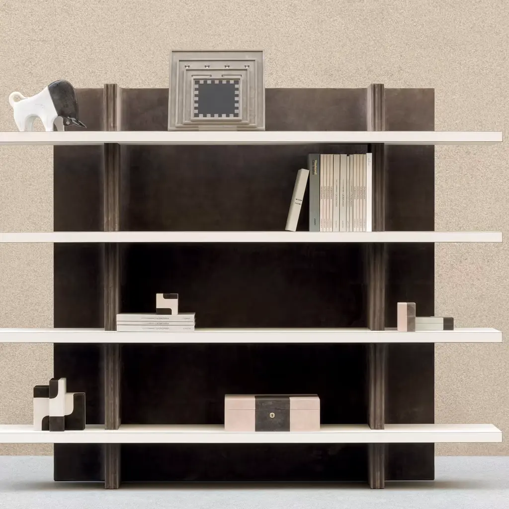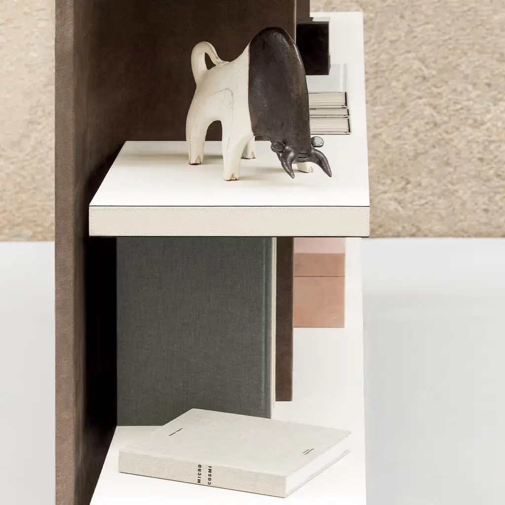Designed by Stéphane Parmentier, this stunning bookshelf will become the true protagonist of any interior, with its simple geometry and luxurious details. Inspired by the graphic and optical art of the 70s, particularly by Victor Vasarely's grid-like paintings, this piece is composed of four light gray leather shelves intersected by two vertical poles covered in smoked suede leather. The visual geometry is enhanced by the suede panel in the same smoked suede color. Shelves are available also in printed calfskin and suede upon request.