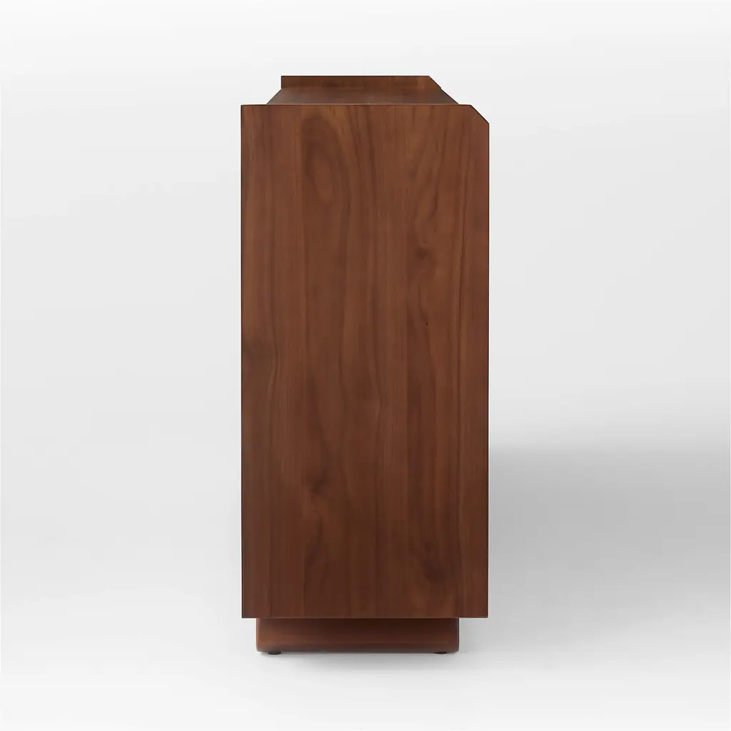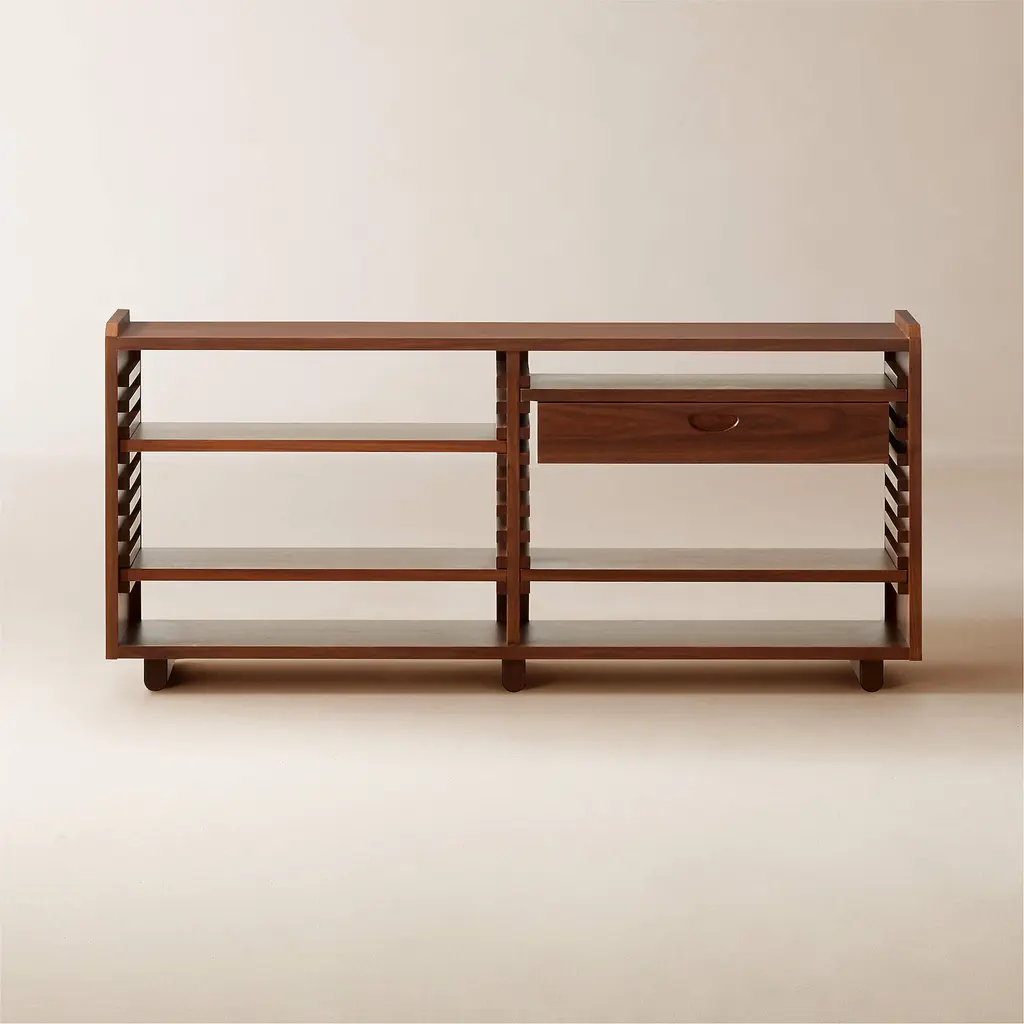 Low-slung bookshelf by Los Angeles-based Lawson-Fenning evolves to fit storage needs. The simplicity of its straightforward construction highlights the grain of walnut, which is certified sustainable by the Forest Stewardship Council ® (FSC). Four adjustable shelves can be slotted to accommodate books of various sizes, while a removable wood glide drawer with carved handle keeps small items concealed. CB2 exclusive.