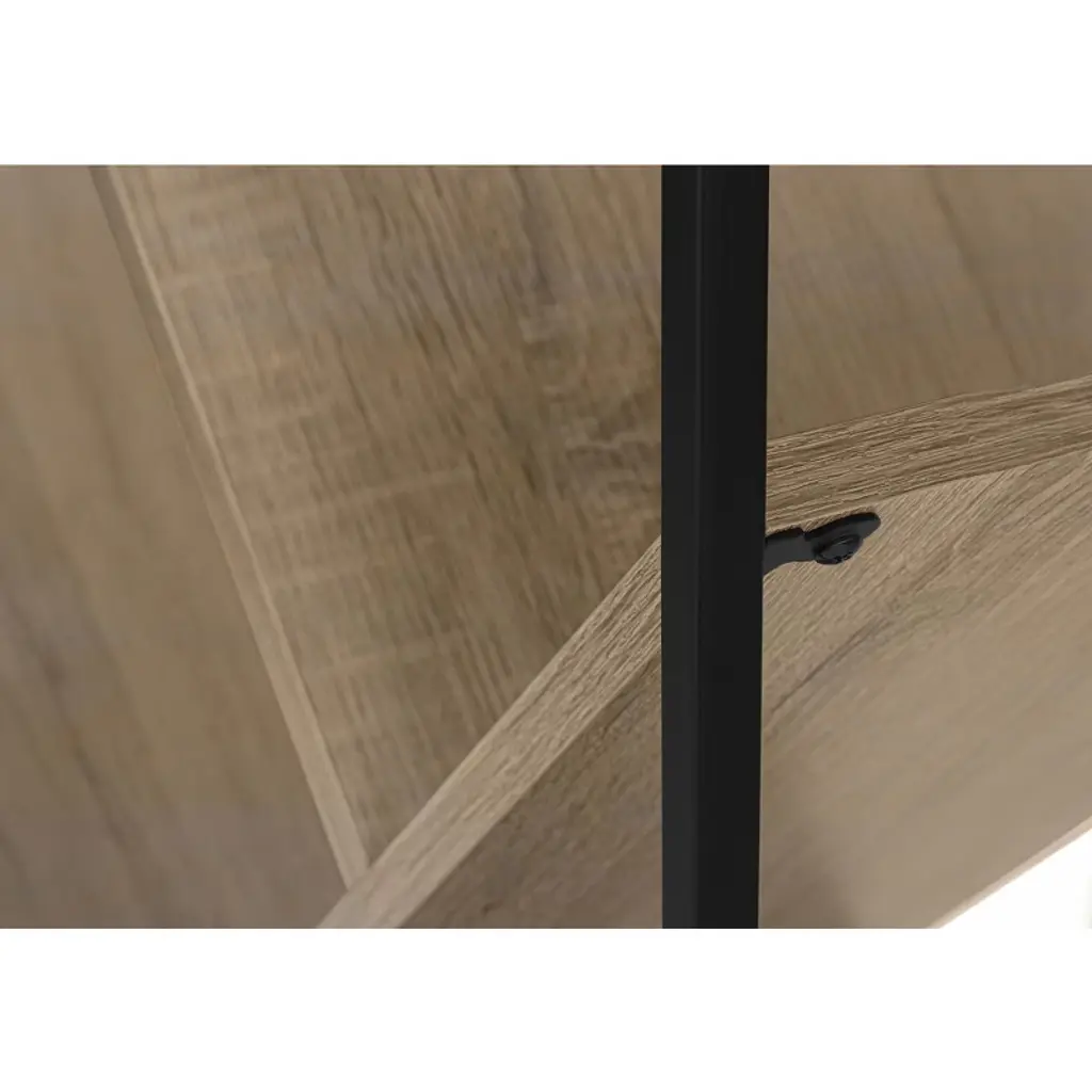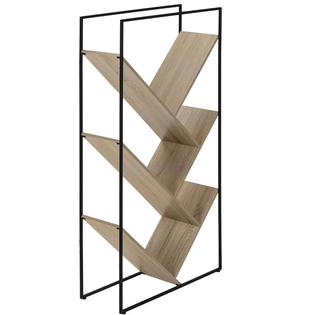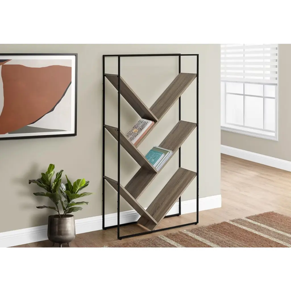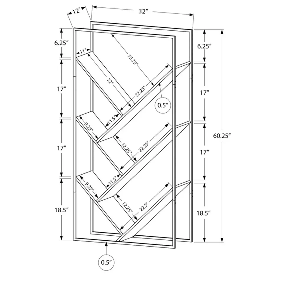This 60 - inch - high 3 - tier bookshelf is a contemporary masterpiece that combines style and functionality. Its design features slanted shelves, creating multiple V - shaped storage areas in various sizes, which not only add an interesting visual element but also provide unique storage spaces for your books, decor items, or collectibles. The open shelves, finished on all sides in a dark taupe wood - look with a realistic wood - grain texture, give a warm and inviting feel. The slim black metal frame not only offers sturdy support but also adds a modern edge to the overall aesthetic. Measuring 32 inches in length, 12 inches in width, and 60.25 inches in height, it's perfect for an office to organize work - related materials or a bedroom to display your favorite reads. Although assembly is required, the end result is a stunning piece that will enhance any space.