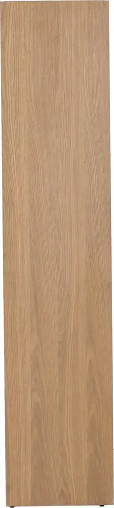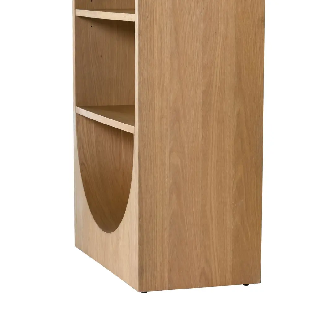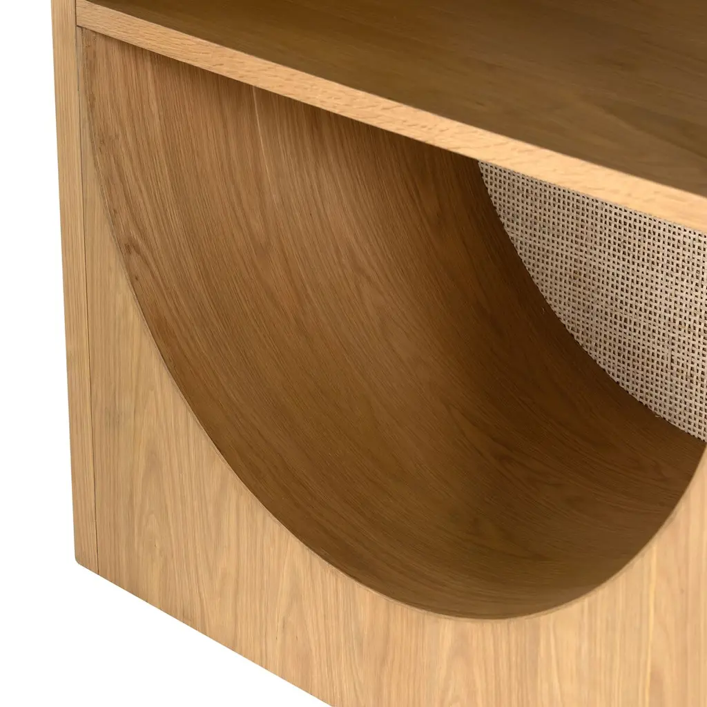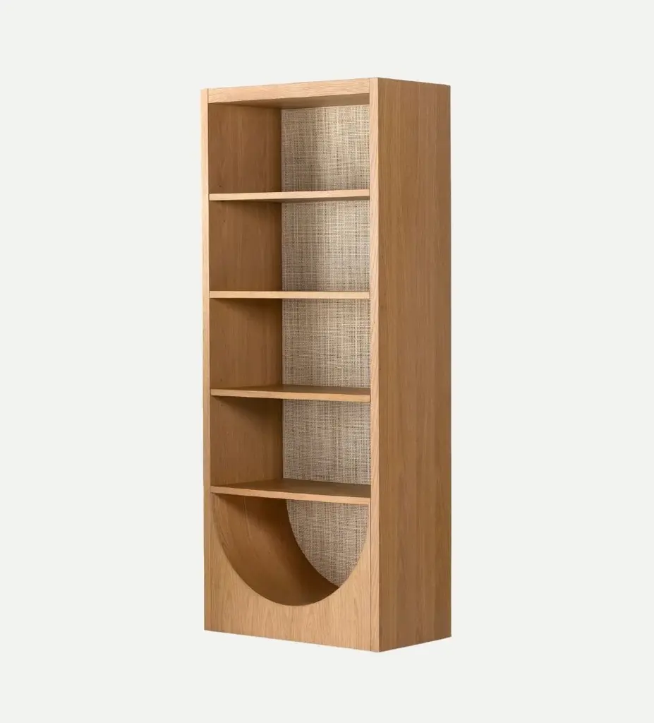Standing seven feet tall, with an eye-catching arch on the bottom, this bookcase pairs durable, beautifully figured oak with a handwoven cane back panel. It will bring a wealth of organic elegance to a room.