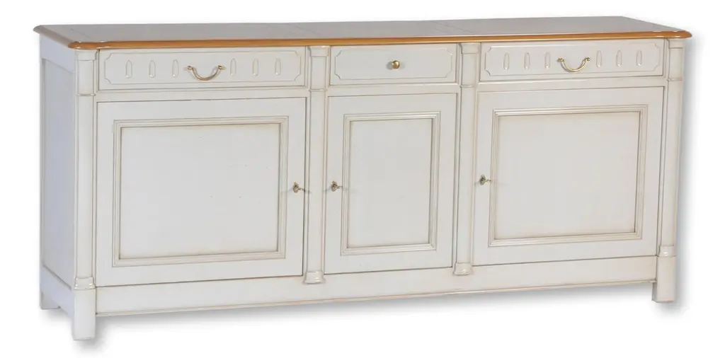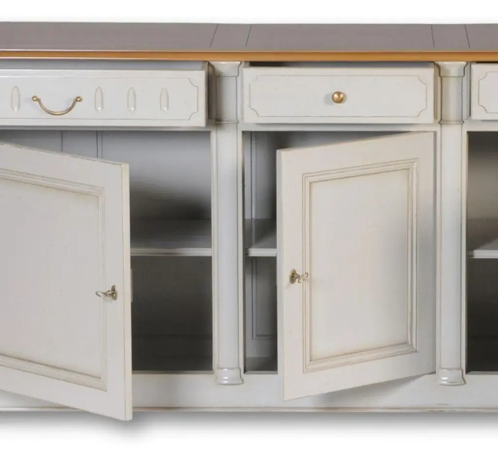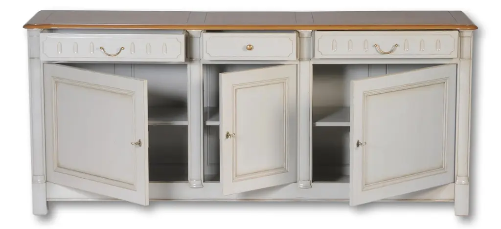 This Buffet is made out of French solid cherry wood . It features three drawers with dove mounted fronts, three doors and an inside cherry shelf. The top in cherry wood is stained. The rest of the structure lacquered in light grey gives this buffet a charm finish.This Buffet's design is in a French Countryside style, also called "Campagne chic".The sourcing of the solid wood comes from sustainably managed French forests.GONTIER, a brand of MON PETIT MEUBLE FRANCAIS group, provides you exclusively with 100% made in France classical and contemporary pieces of furniture.The manufacture of each furniture is made accordingly to traditional French techniques of woodworking by small craft workshops in the western countryside of France (Loire Valley and Bretagne). We offer a 5 year warranty on each piece.