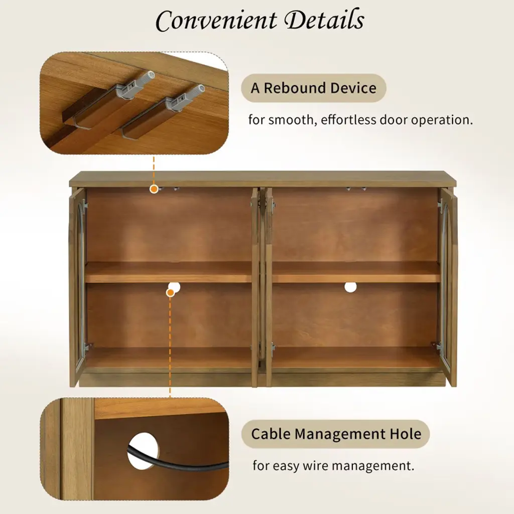 The sideboard cabinet’s shelves can be adjusted to three different heights, allowing for customized storage solutions. The shelves are also removable to suit larger items or rearranging, making this buffet cabinet with storage a functional addition to any room.The storage cabinet features a cable hole at the back for easy wire management, helping to keep your space neat and organized. Its handleless design adds to the sleek, minimalist aesthetic. Additionally, the interior includes a rebound device for smooth, effortless door operation.