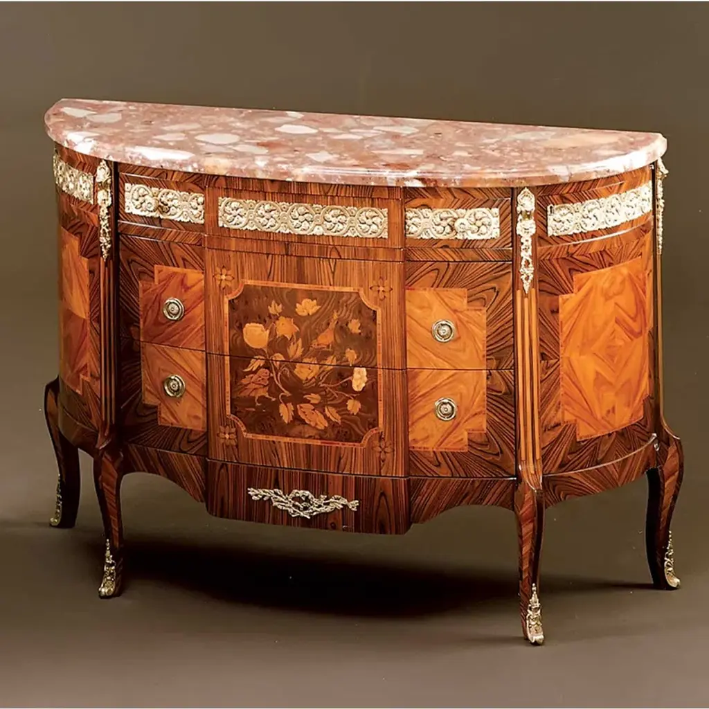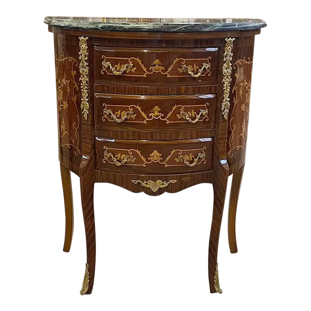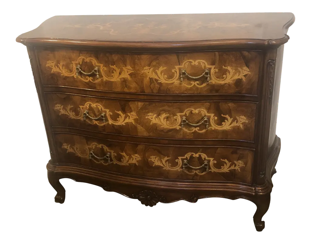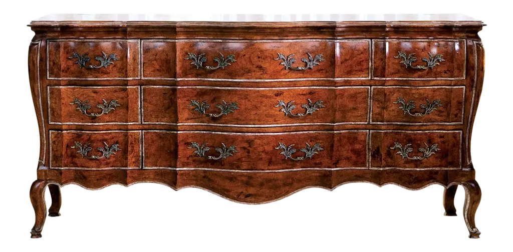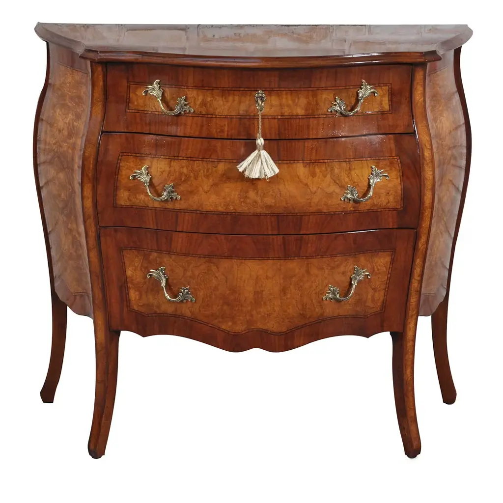 Baroque two-drawer chest. Walnut stain finishes with black highlights. Detailed carvings. Hand-painted.