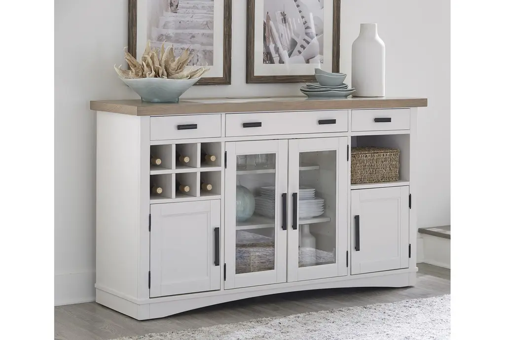 The Amery White + Brown Two Tone 4 Glass Door 4 Drawer 66" Sideboard Buffet with Wine Storage is a stylish and functional addition to any kitchen or dining room. Crafted from 80% poplar solids and 20% birch veneers, this rectangular sideboard features a charming farmhouse design in a soft cotton color. With ample storage space, including drawers and doors, it is perfect for organizing your dining essentials.