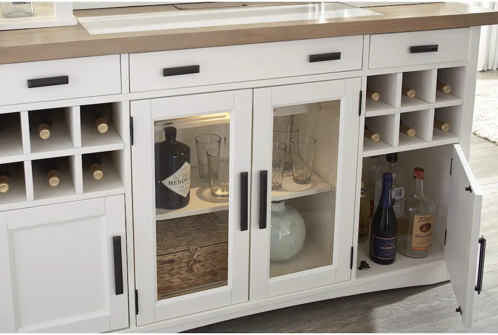 Amery White + Brown Two Tone 4 Glass Door 4 Drawer 66" Sideboard Buffet With Wine Storage