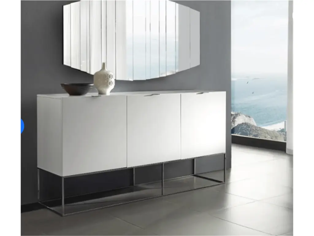buffet-server in high gloss white lacquer with high polished stainless steel. Home features clean, modern lines adding a sophisticated look and edge to any room.