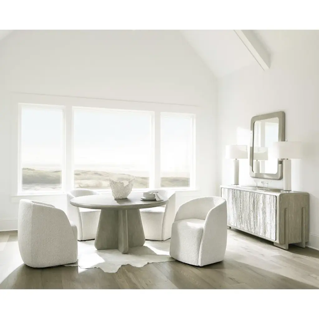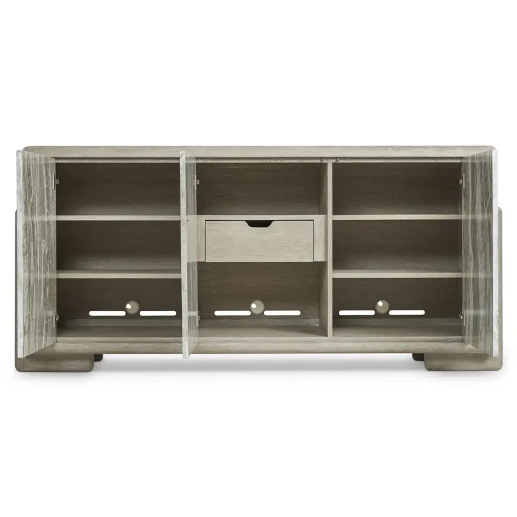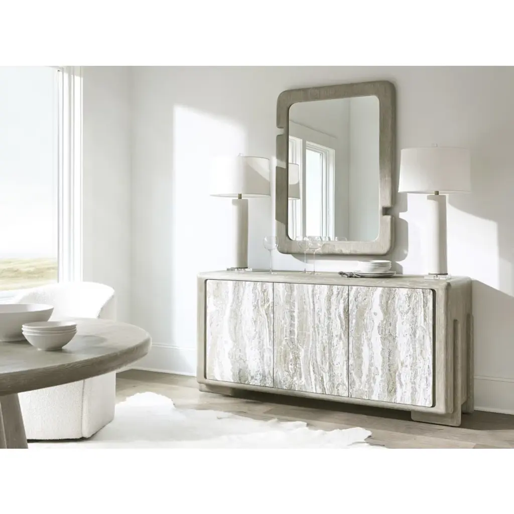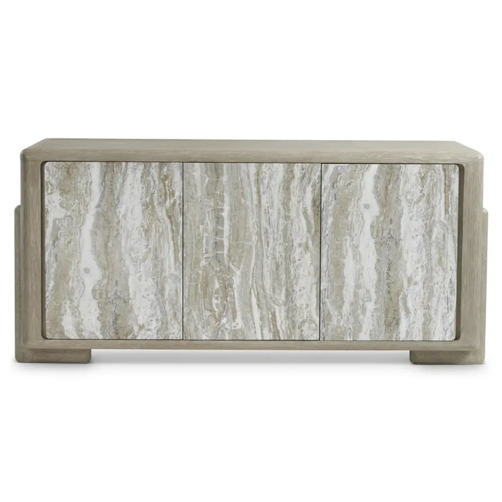 An elemental, serene design marks this stunning Arcadia buffet. The three doors have faux stone overlays in a Kalta finish miming flowing woodgrain or swirls of natural marble. The wire-brushed oak case in clay finish offers a tactile element, while the interior provides the necessary functionality.
