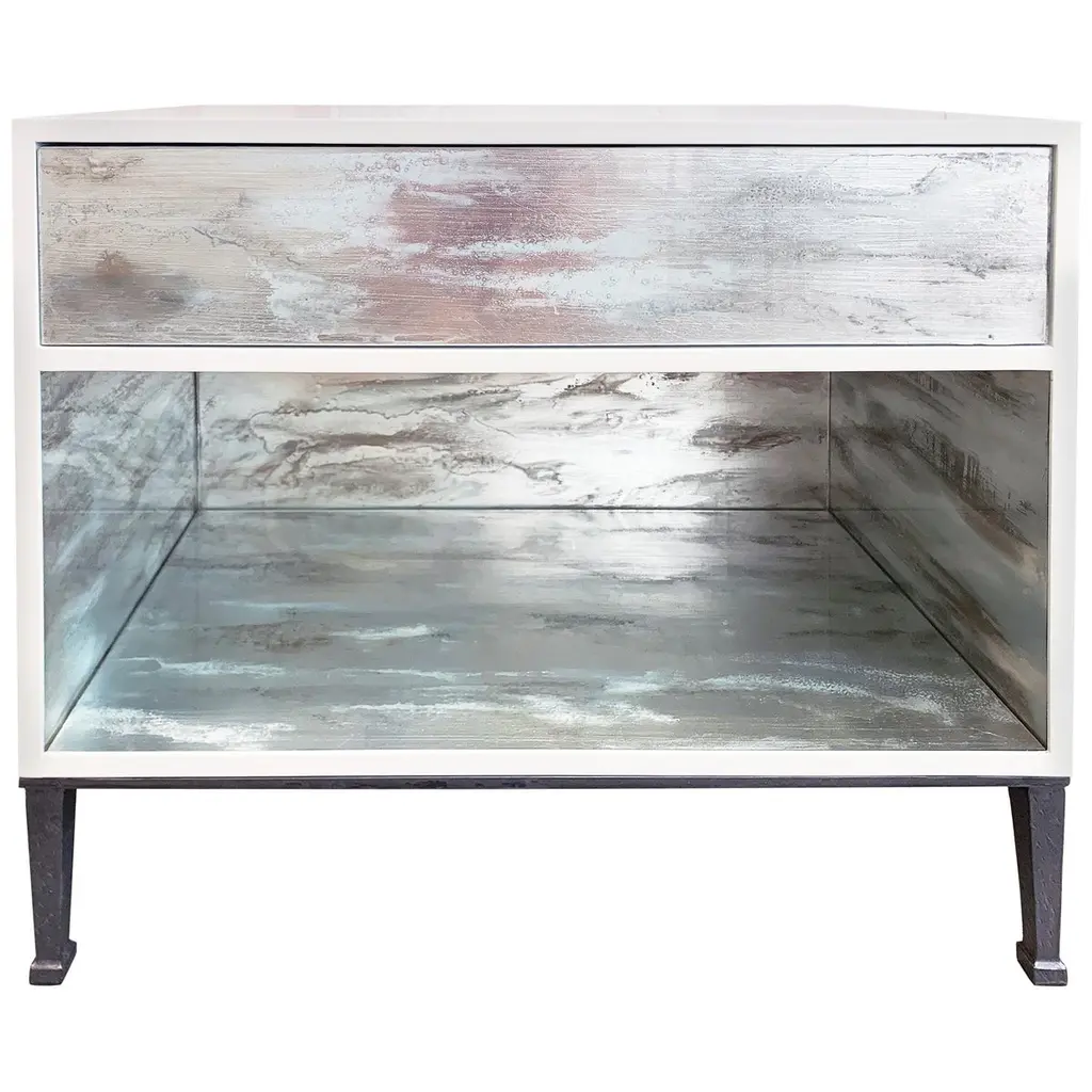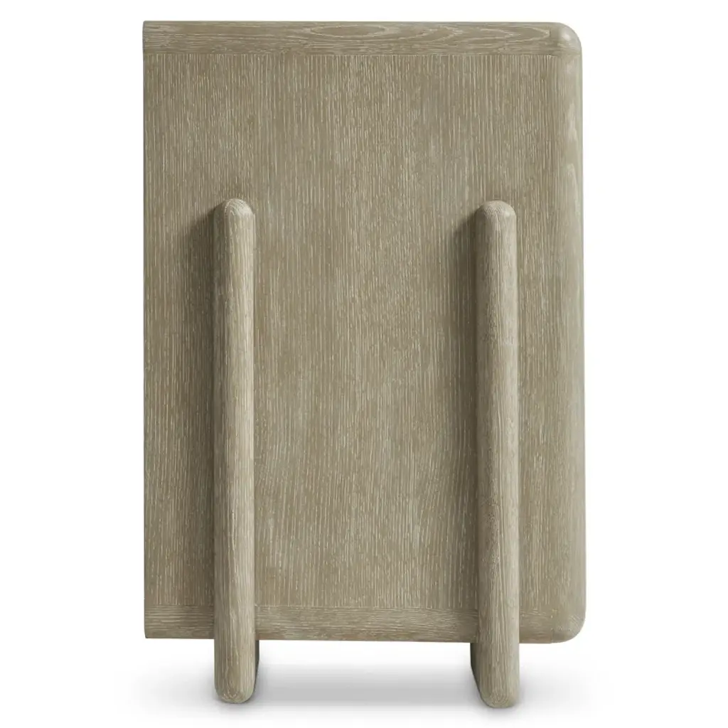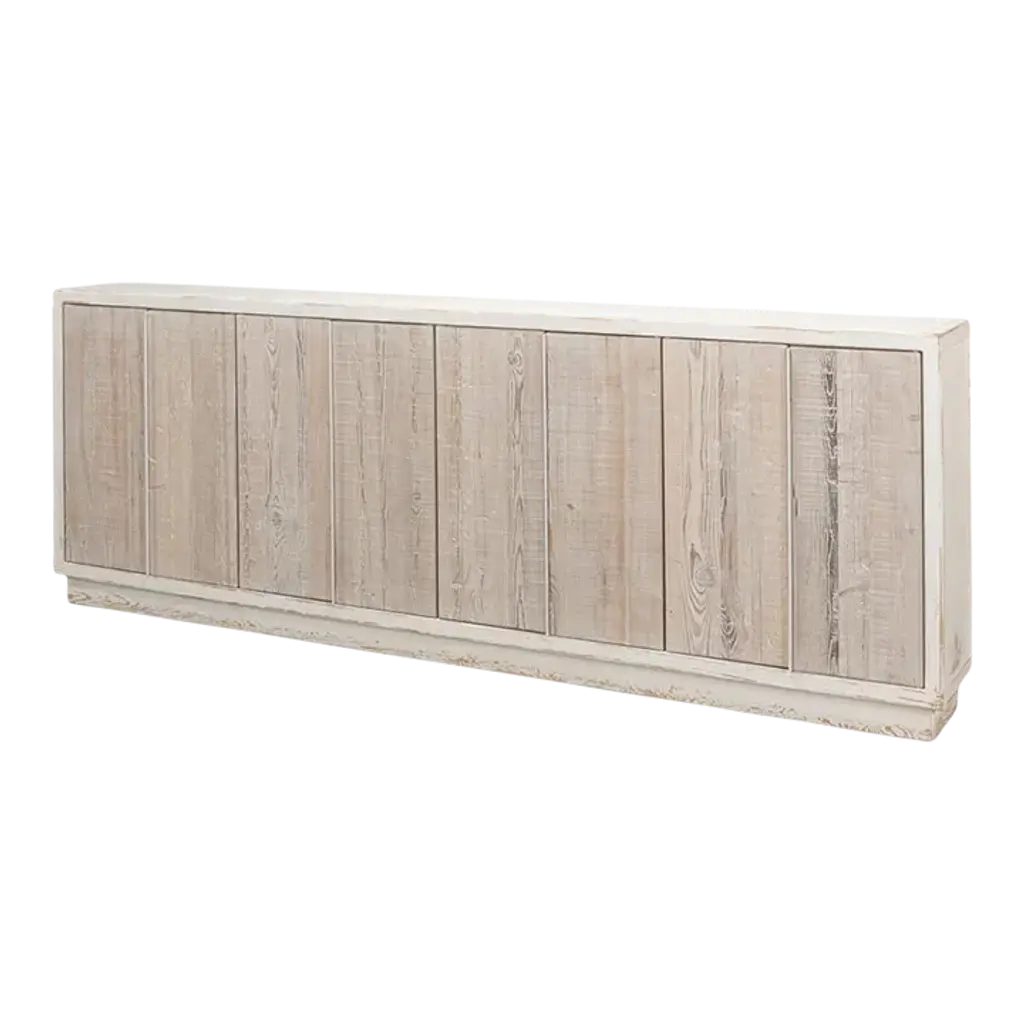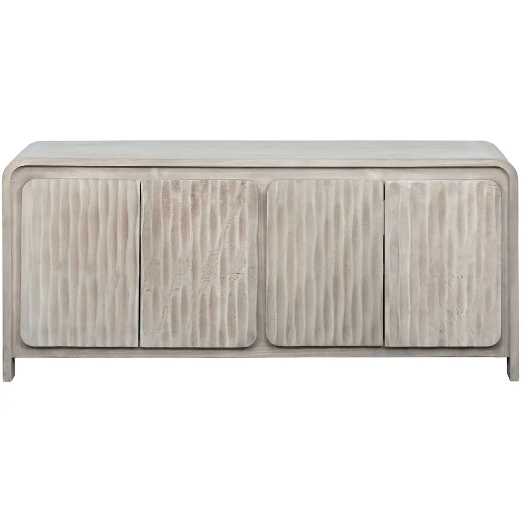 An elemental, serene design marks this stunning Arcadia buffet. The three doors have faux stone overlays in a Kalta finish miming flowing woodgrain or swirls of natural marble. The wire-brushed oak case in clay finish offers a tactile element, while the interior provides the necessary functionality.