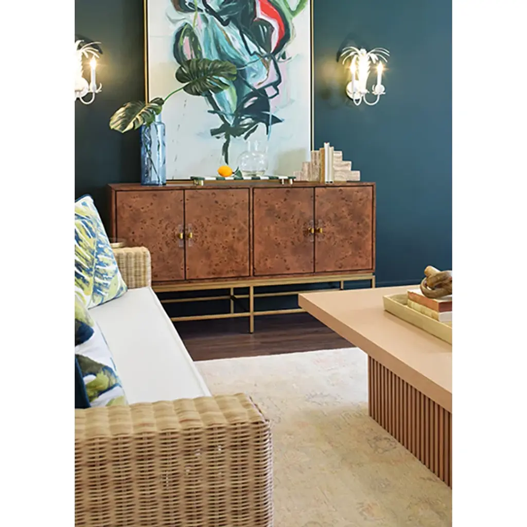 Four-door buffet with antique brass metal base.