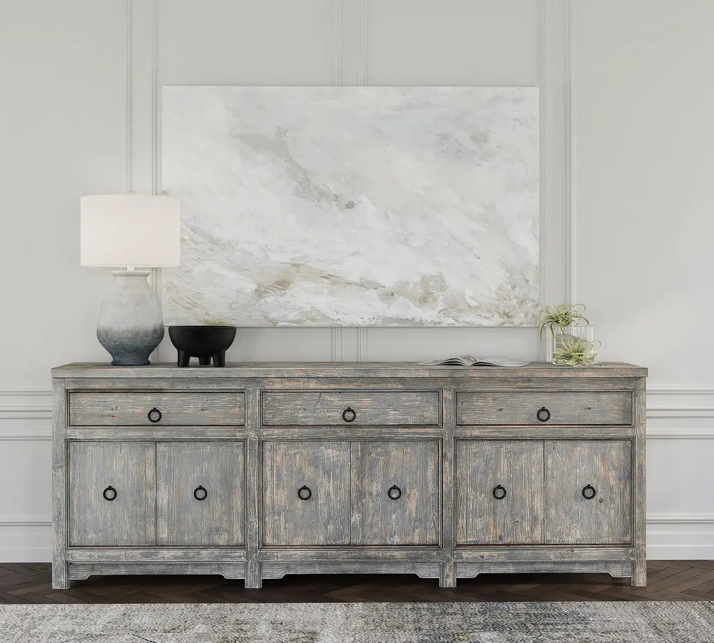 Reclaimed pine gets a coastal makeover in this beautiful buffet. Hand finished in a subtle shade of blue, it shows the natural grain and markings of the original lumber under a light color, accented by rustic metal ring hardware. Ideal in a dining room or entryway, it adds fresh perspective and ample storage to your space.