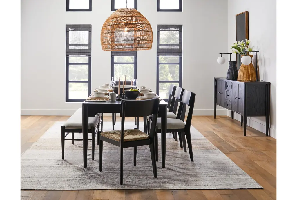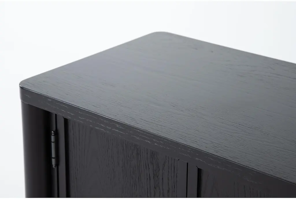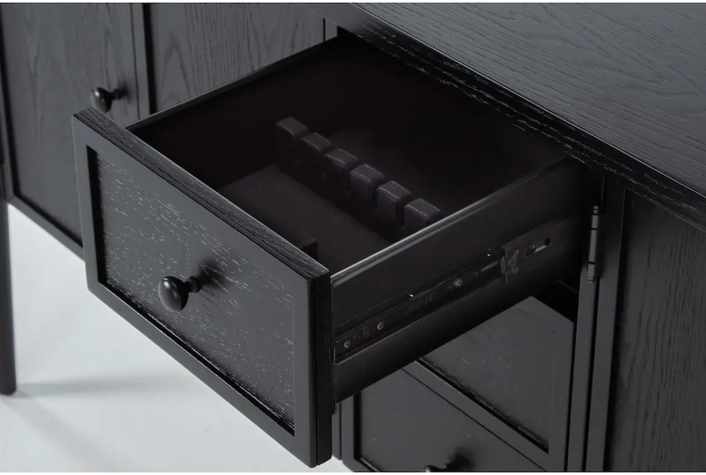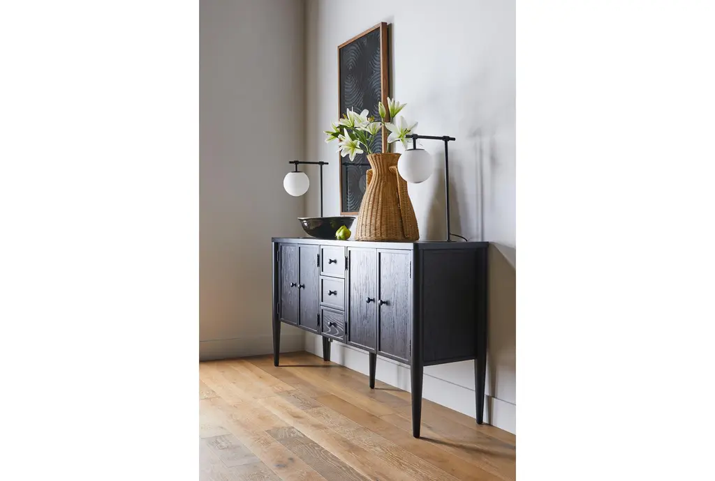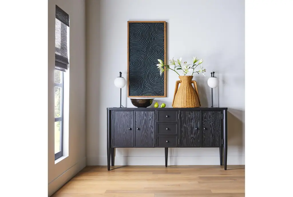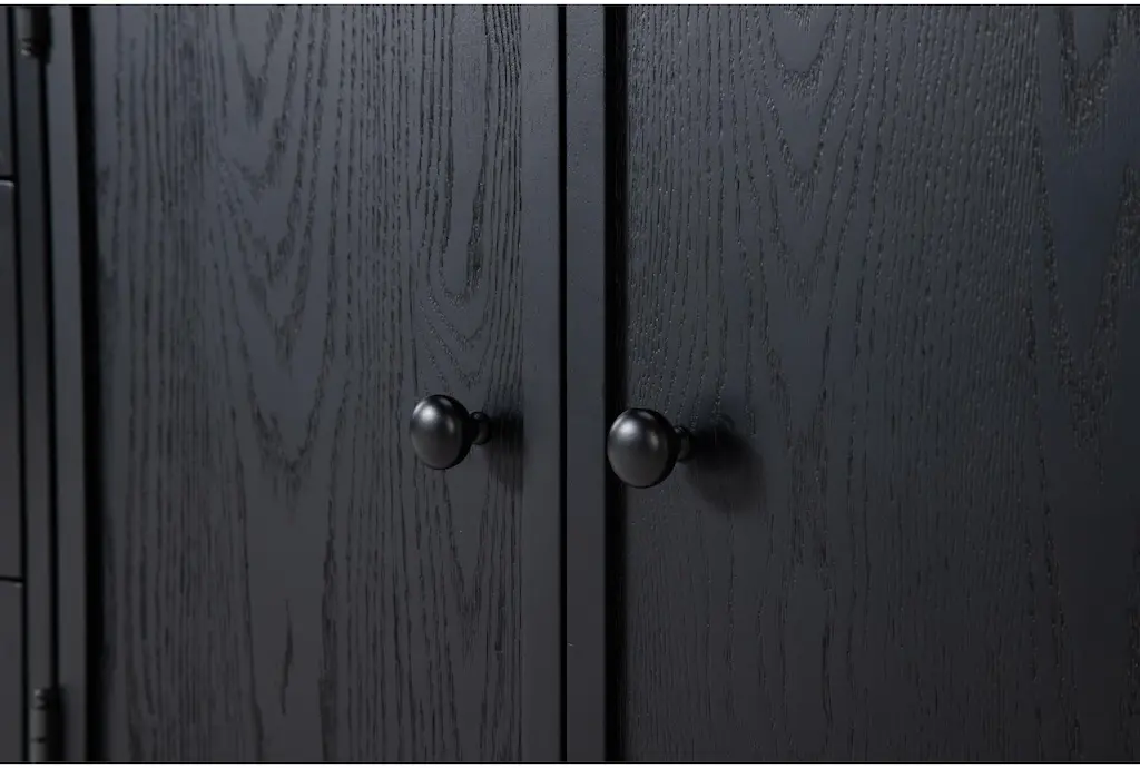 The Austen Black Wood Sideboard Buffet combines traditional style with modern functionality. This 70-inch sideboard features four doors and three drawers, offering ample storage for your dining or kitchen essentials. Made with oak veneer and solid rubberwood, this piece is built to last and includes adjustable shelves for customizable storage options.