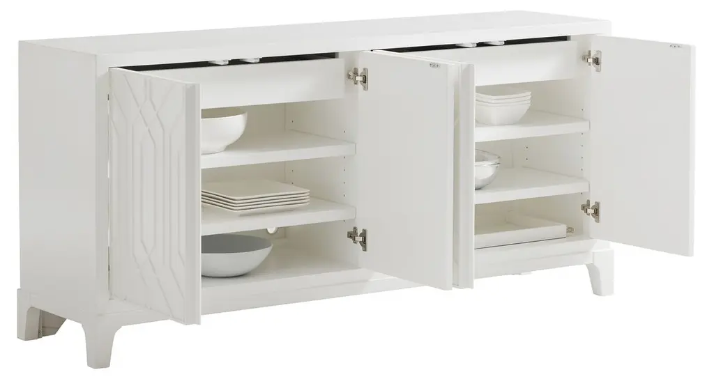 Geometric fretwork on the doors gives this buffet a sophistication that will never go out of style. Behind each pair of doors are two adjustable shelves, a felt-lined drawer, and cutouts for cord management, enabling the sideboard to double as media storage. One of the drawers is divided for storage silverware.