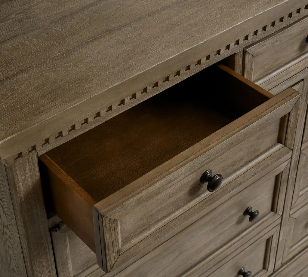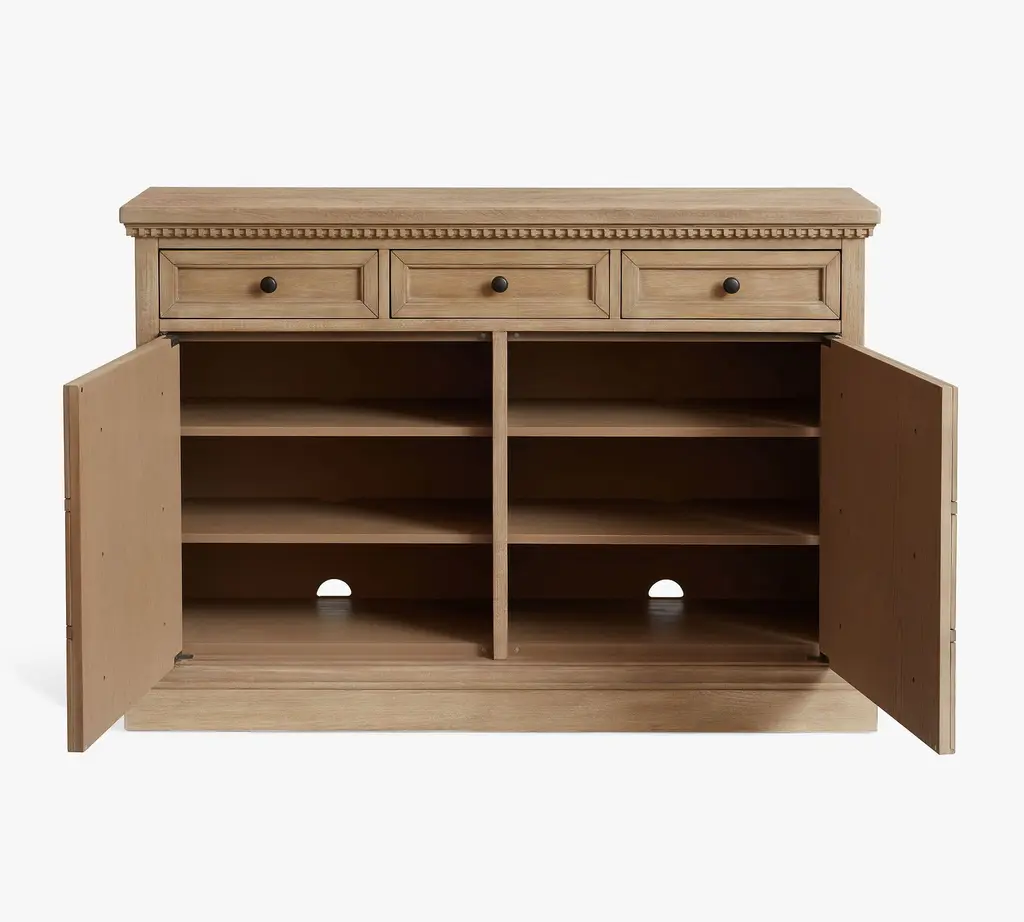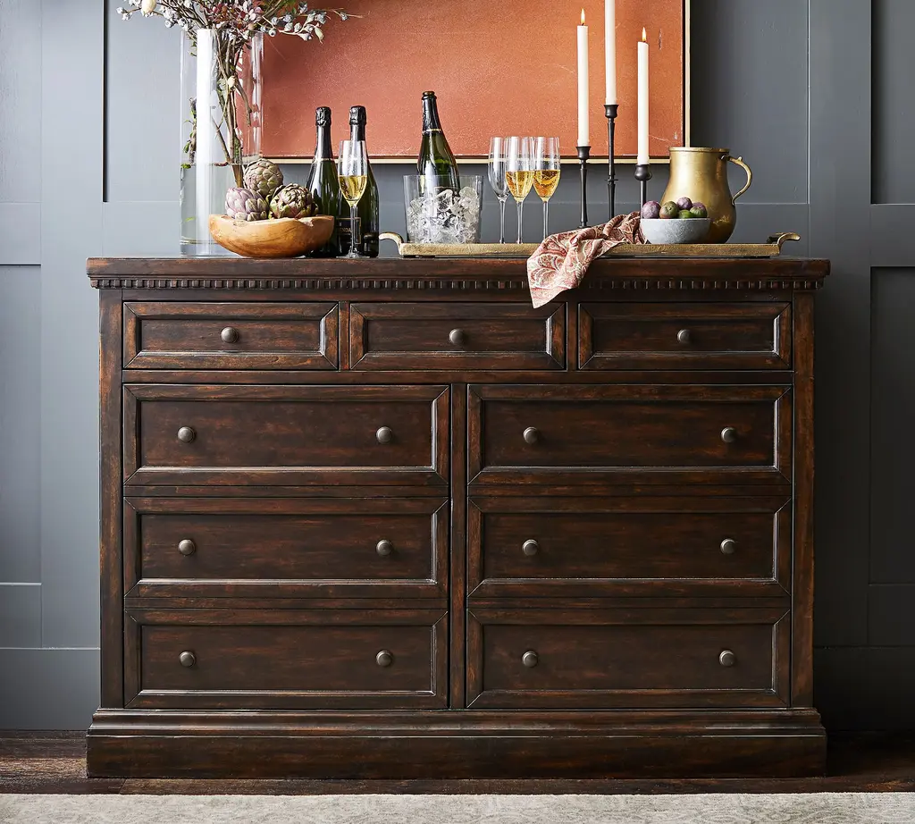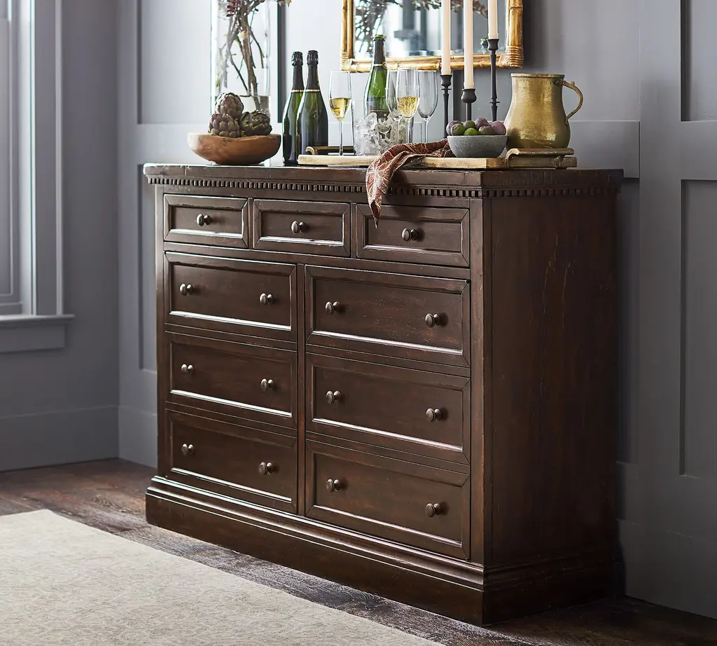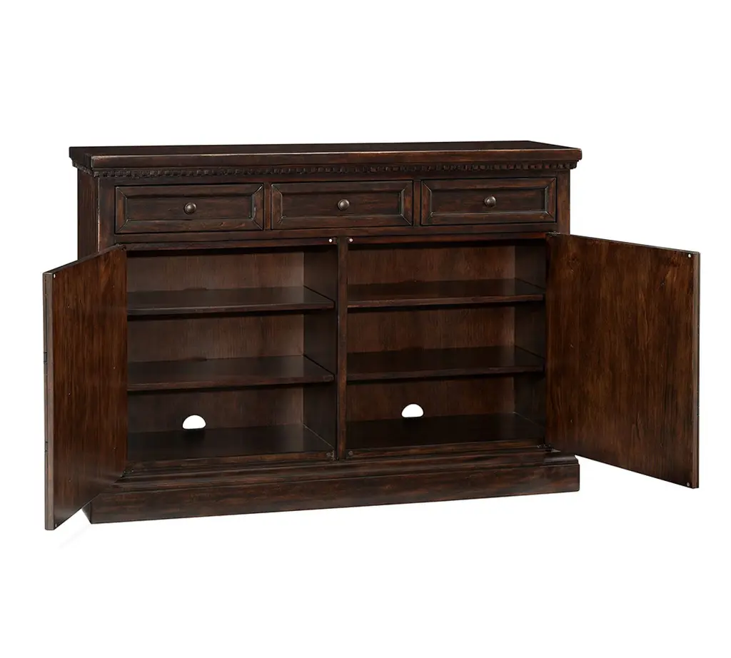 With its rustic beauty, this dining room essential imparts the look of an antique. Discreet and adjustable shelving lies behind a pair of faux-drawer overlays in the Banks Buffet, and drawers provide quick access to essentials.