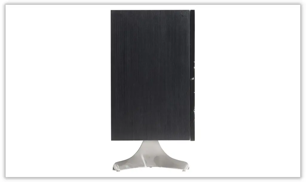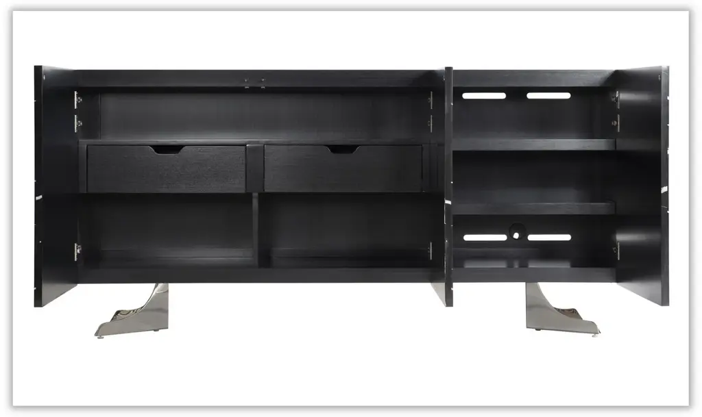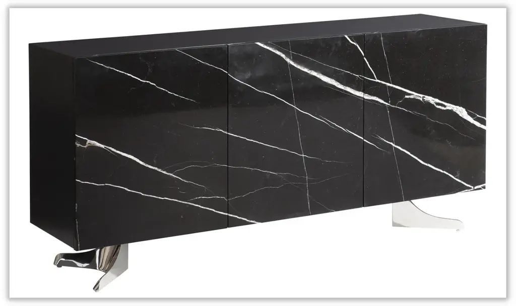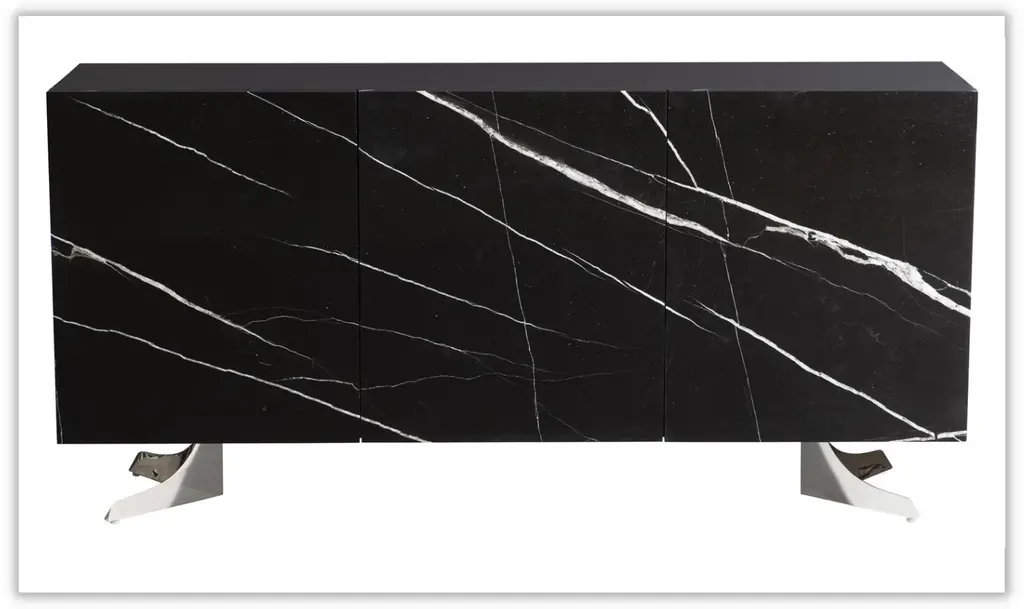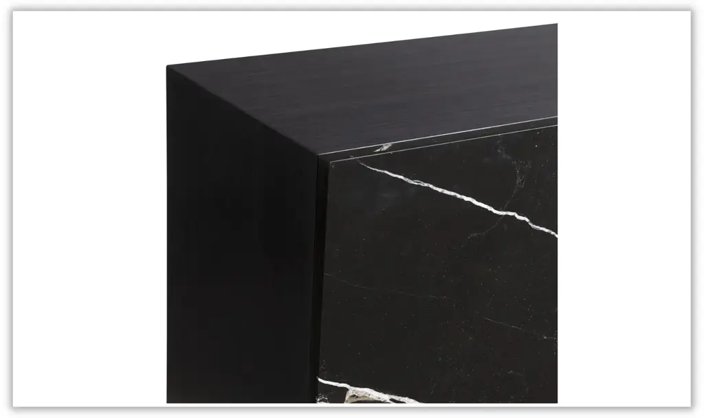 Introducing the Imani 2 Drawer Buffet, a striking fusion of dramatic style and functional design. The buffet features Nero Marquina laminated stone overlays on three push-to-open doors, creating a captivating visual impact. The polished and angled stainless steel feet provide a stunning contrast, elevating the overall aesthetic. Crafted with precision, the buffet boasts an Onyx finish on the engineered veneer case top, end panels, and interior, adding depth to the design. The interior reveals thoughtful details, including one fixed shelf, two drawers, and two adjustable/removable shelves per case. The left and center doors conceal a fixed shelf above two soft-close drawers with hand-pull cutouts, featuring a black Guardian cloth-wrapped pad and a black silverware insert. The right door opens to two adjustable/removable shelves with vents and a covered grommet hole in the back panel, offering versatile storage options. The buffet stands on two Polished Stainless Steel angled feet with adjustable glides for stability. For added safety, the buffet includes an anti-tip kit and instruction sheet.
