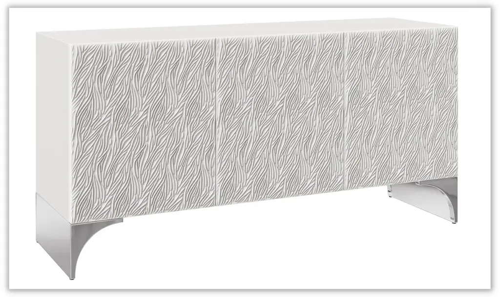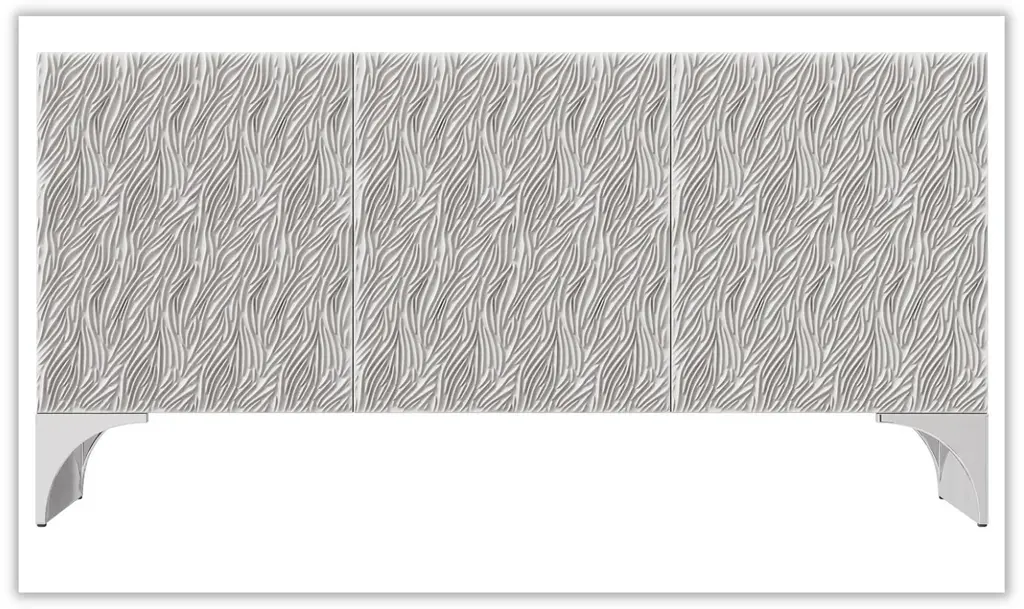 Discover the Stratum 3-Door Buffet Đ a masterpiece of artistry and functionality. The sculpted cast resin door fronts boast an intricate pattern inspired by the graceful movement of wheat fields, creating a captivating focal point for your dining or living space. Behind the three pull-to-open, soft-close doors lies a thoughtfully designed interior. Each left and right door features a fixed shelf and a center soft-close drawer with a hand-pull cutout, accompanied by open compartments above and below the drawer. The black Guardian cloth-wrapped pad in the left drawer and the silverware insert in the right drawer add a touch of luxury. The center door reveals two adjustable and removable shelves, four vent holes, and a covered grommet hole in the back panel, catering to your storage needs. The sides and top showcase a Fossil white faux stone finish with a carved pattern, while the base rests elegantly on two steel base panels in a Polished Nickel finish. Enhance your space with the Stratum Buffet Đ where meticulous craftsmanship meets artistic inspiration. The adjustable glides ensure stability, making this buffet a stylish and functional addition to your home.