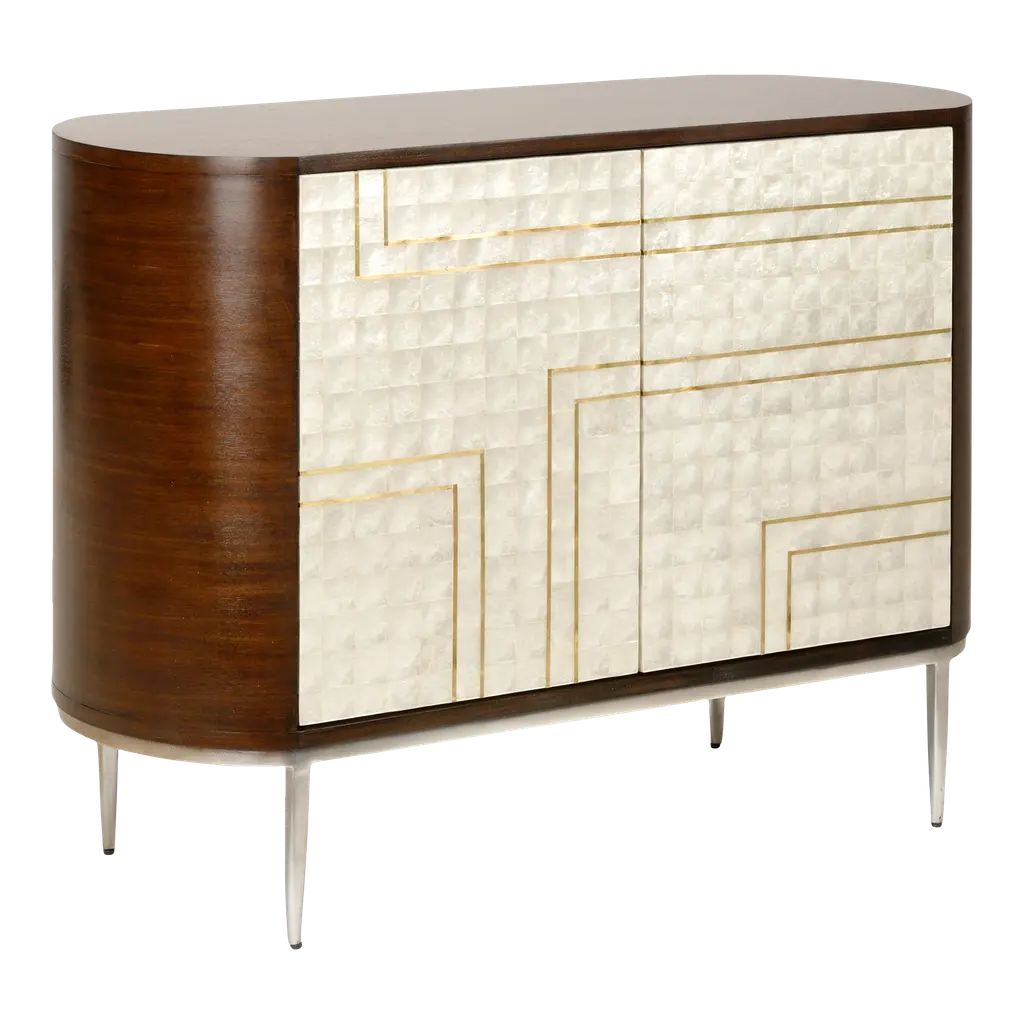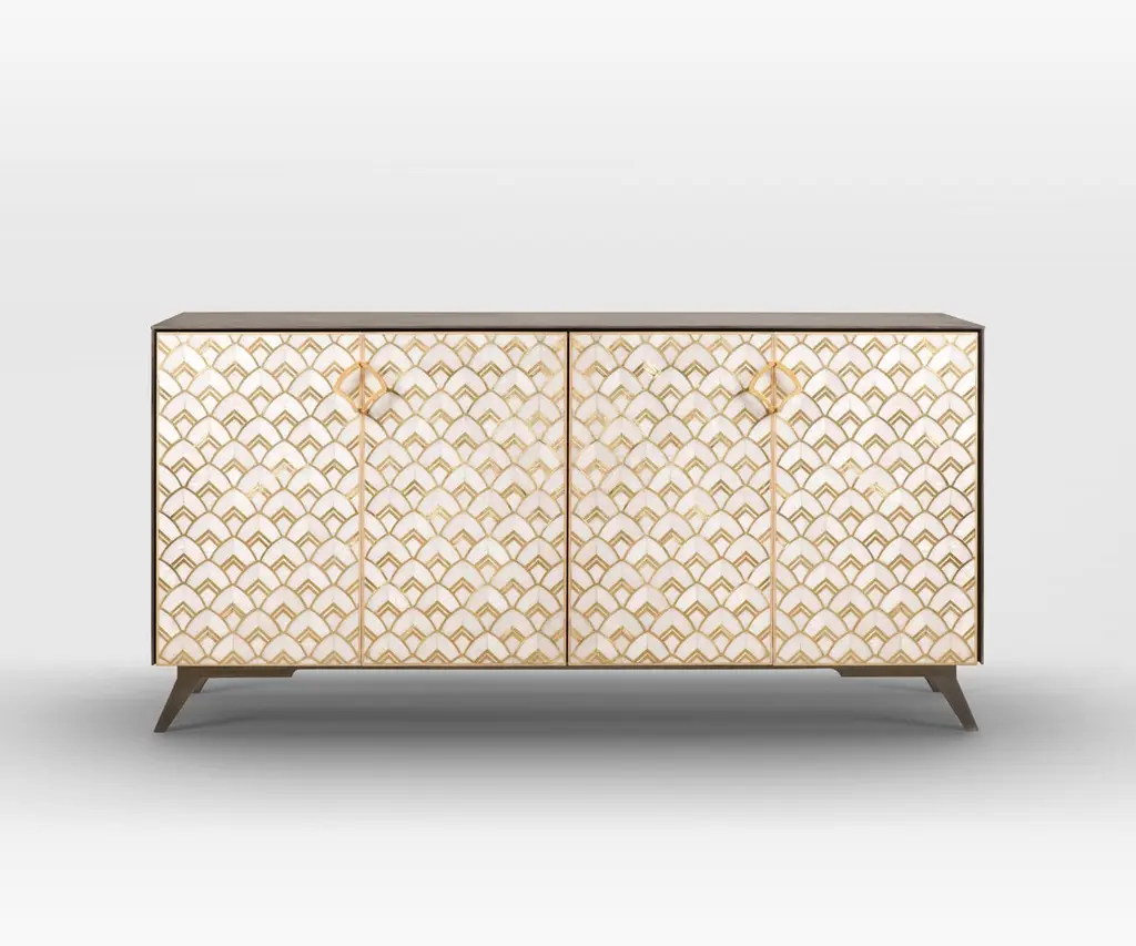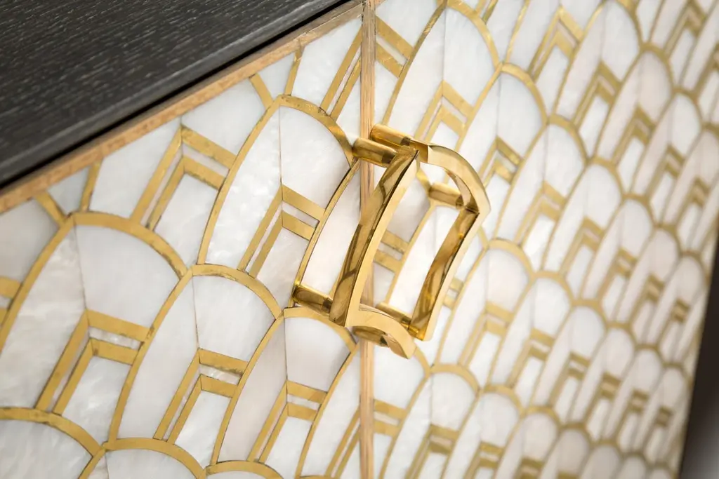 Brass Lotus Pattern Handcrafted into Mother-of-Pearl Buffet Encased in Oak Body.Our Golden Lotus cabinet makes an unorthodox elegant buffet that will not only uplift your dining room but will also be a celebration of Egyptian “art de vivre”. Its smooth & shiny texture of brass with faux Mother-of-Pearl lotus motif and encased in a burnt brown Oak body gives it effortless luxury for modern living.