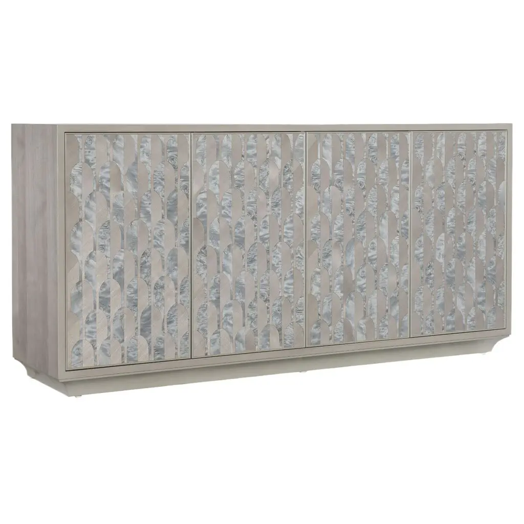 Brass Lotus Pattern Handcrafted Into Mother-Of-Pearl Buffet Encased In Oak Body
